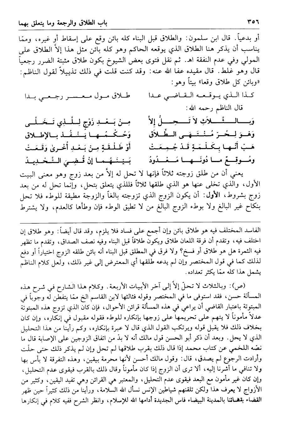 ا هـ ثم نقل فتوى بعض الشيوخ بكون طلاق مثبتة الضرر رجعيا قال وهو غلط قال مقيده عفا الله عنه وقد كنت قلت في ذلك تذييلا لقول الناظم وبائن كل طلاق أوقعا بيتا وهو كذا الذي يوقعه القاضي عدا طلاق مول معسر رجعي بدا قال الناظم رحمه الله