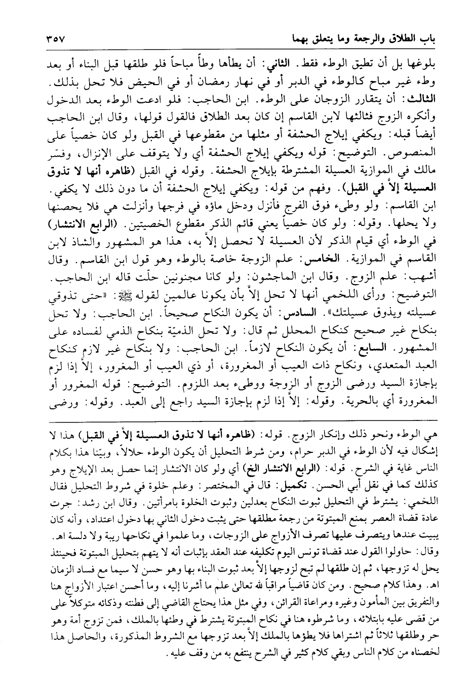السابع أن يكون النكاح لازما ابن الحاجب ولا بنكاح غير لازم كنكاح العبد المتعدي ونكاح ذات العيب أو المغرورة أو ذي العيب أو المغرور إلا إذا لزم بإجازة السيد ورضي الزوج أو الزوجة ووطئ بعد اللزوم التوضيح قوله المغرور أو المغرورة أي بالحرية وقوله إلا إذا لزم بإجازة السيد راجع إلى العبد وقوله ورضي