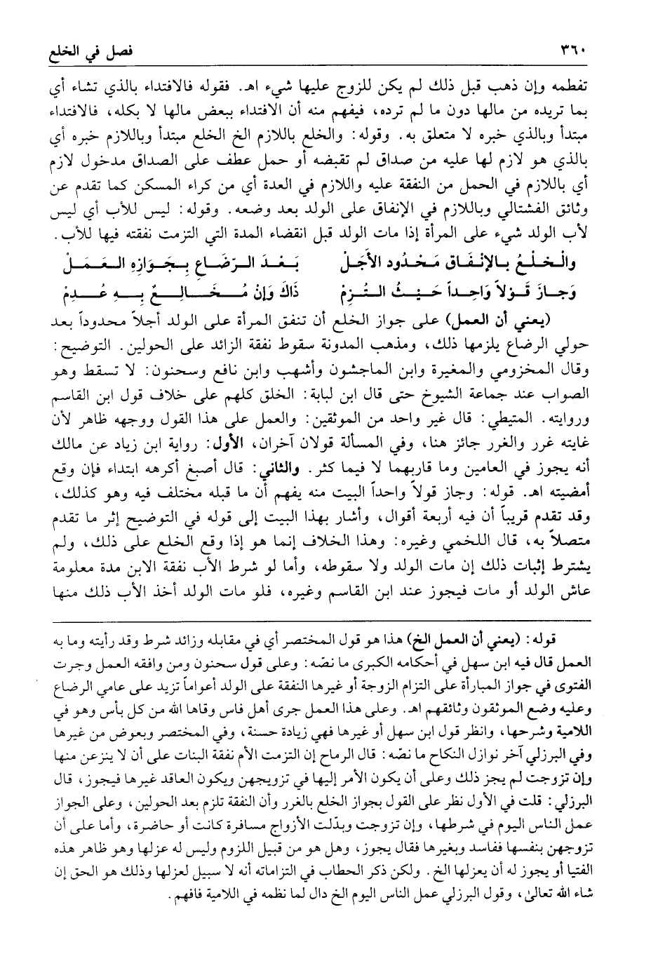 والخلع بالإنفاق محدود الأجل بعد الرضاع بجوازه العمل وجاز قولا واحدا حيث التزم ذاك وإن مخالع به عدم يعني أن العمل على جواز الخلع أن تنفق المرأة على الولد أجلا محدودا بعد حولي الرضاع يلزمها ذلك ومذهب المدونة سقوط نفقة الزائد على الحولين التوضيح وقال المخزومي والمغيرة وابن الماجشون وأشهب وابن نافع وسحنون لا تسقط وهو الصواب عند جماعة الشيوخ