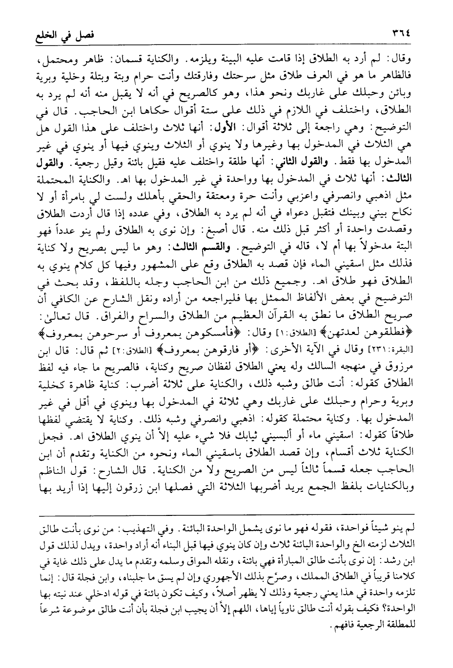 ونقل الشارح عن الكافي أن صريح الطلاق ما نطق به القرآن العظيم من الطلاق والسراح والفراق قال تعالى فطلقوهن لعدتهن وقال فأمسكوهن بمعروف أو سرحوهن بمعروف وقال في الآية الأخرى أو فارقوهن بمعروف