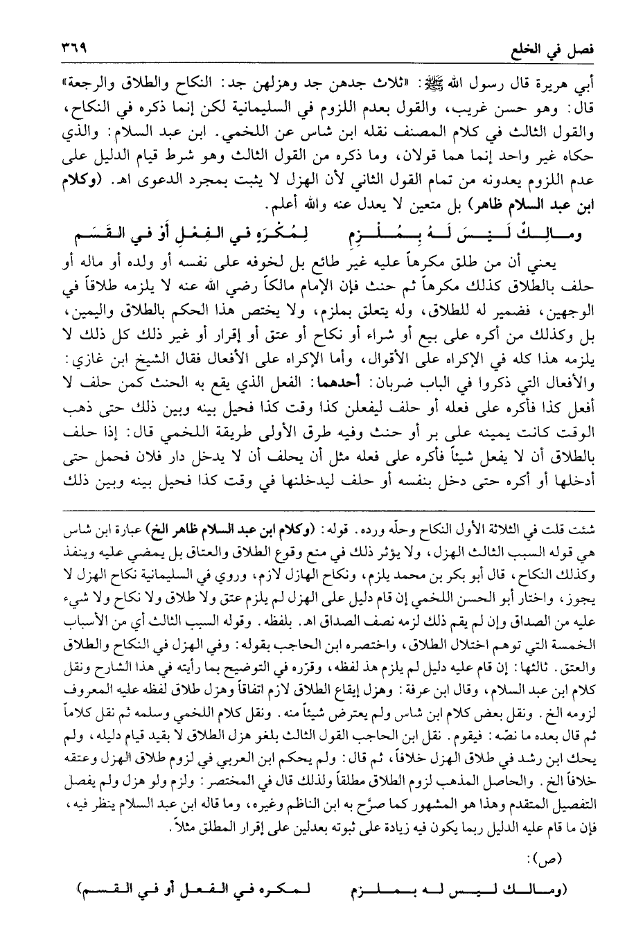 أبي هريرة قال رسول الله صلى الله عليه وسلم ثلاث جدهن جد وهزلهن جد النكاح والطلاق والرجعة قال وهو حسن غريب والقول بعدم اللزوم في السليمانية لكن إنما ذكره في النكاح والقول الثالث في كلام المصنف نقله ابن شاس عن اللخمي ابن عبد السلام والذي حكاه غير واحد إنما هما قولان وما ذكره من القول الثالث وهو شرط قيام الدليل على عدم اللزوم يعدونه من تمام القول الثاني لأن الهزل لا يثبت بمجرد الدعوى ا هـ وكلام ابن عبد السلام ظاهر بل متعين لا يعدل عنه والله أعلم