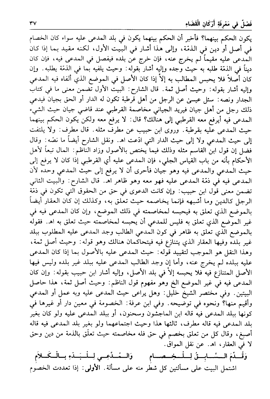 يكون الحكم بينهما فأخبر أن الحكم بينهما يكون في بلد المدعى عليه سواء كان الخصام في أصل أو دين في الذمة وإلى هذا أشار في البيت الأول لكنه مقيد بما إذا كان المدعى عليه مقيما لم يخرج عنه فإن خرج عن بلده فيفصل في المدعى فيه فإن كان دينا في الذمة طلبه به حيث وجده وإليه أشار بقوله وحيث يلفيه بما في الذمه يطلبه وإن كان أصلا فلا يحبس المطالب به إلا إذا كان الأصل في الموضع الذي ألفاه فيه المدعي وإليه أشار بقوله وحيث أصل ثمه قال الشارح البيت الأول تضمن معنى ما في كتاب الجدار ونصه سئل عيسى عن الرجل من أهل قرطبة تكون له الدار أو ألحق بجيان فيدعى ذلك رجل من أهل جيان فيريد الجياني مخاصمة القرطبي عند قاضي جيان حيث الشيء المدعى فيه أيرفع معه القرطبي إلى هنالك قال لا يرفع معه ولكن يكون الحكم بينهما حيث المدعى عليه بقرطبة وروى ابن حبيب عن مطرف مثله