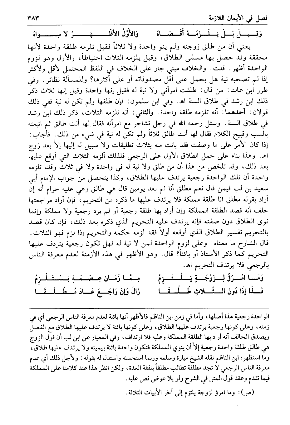 وما امرؤ لزوجة يلتزم مما زمان عصمة يستلزم فذا إذا دون الثلاث طلقا زال وإن راجع عاد مطلقا