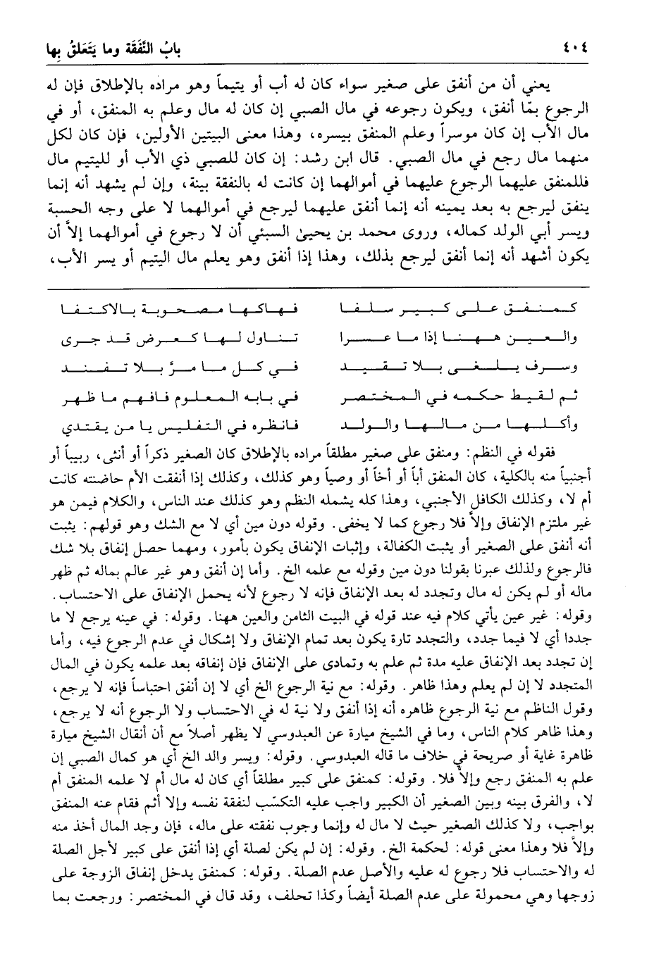 قال ابن رشد إن كان للصبي ذي الأب أو لليتيم مال فللمنفق عليهما الرجوع عليهما في أموالهما إن كانت له بالنفقة بينة وإن لم يشهد أنه إنما ينفق ليرجع به بعد يمينه أنه إنما أنفق عليهما ليرجع في أموالهما لا على وجه الحسبة ويسر أبي الولد كماله وروى محمد بن يحيى السبائي أن لا رجوع في أموالهما إلا أن يكون أشهد أنه إنما أنفق ليرجع بذلك وهذا إذا أنفق وهو يعلم مال اليتيم أو يسر الأب