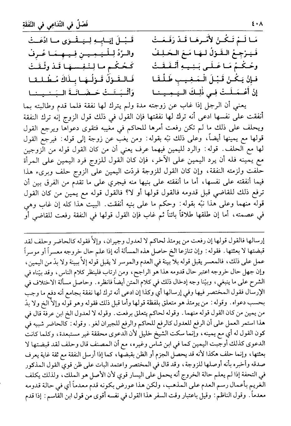 ما لم تكن لأمرها قد رفعت قبل إيابه ليقوى ما ادعت فيرجع القول لها مع الحلف والرد لليمين فيهما عرف وحكم ما على بنيه أنفقت كحكم ما لنفسها قد وثقت فإن يكن قبل المغيب طلقا فالقول قولها بذاك مطلقا إن أعملت في ذلك اليمينا وأثبتت حضانة البنينا يعني أن الرجل إذا غاب عن زوجته مدة ولم يترك لها نفقة فلما قدم وطالبته بما أنفقت على نفسها ادعى أنه ترك لها نفقتها فإن القول في ذلك قول الزوج أنه ترك النفقة ويحلف على ذلك ما لم تكن رفعت أمرها للحاكم في مغيبه فتقوى دعواها ويرجع القول قولها مع يمينها أيضا