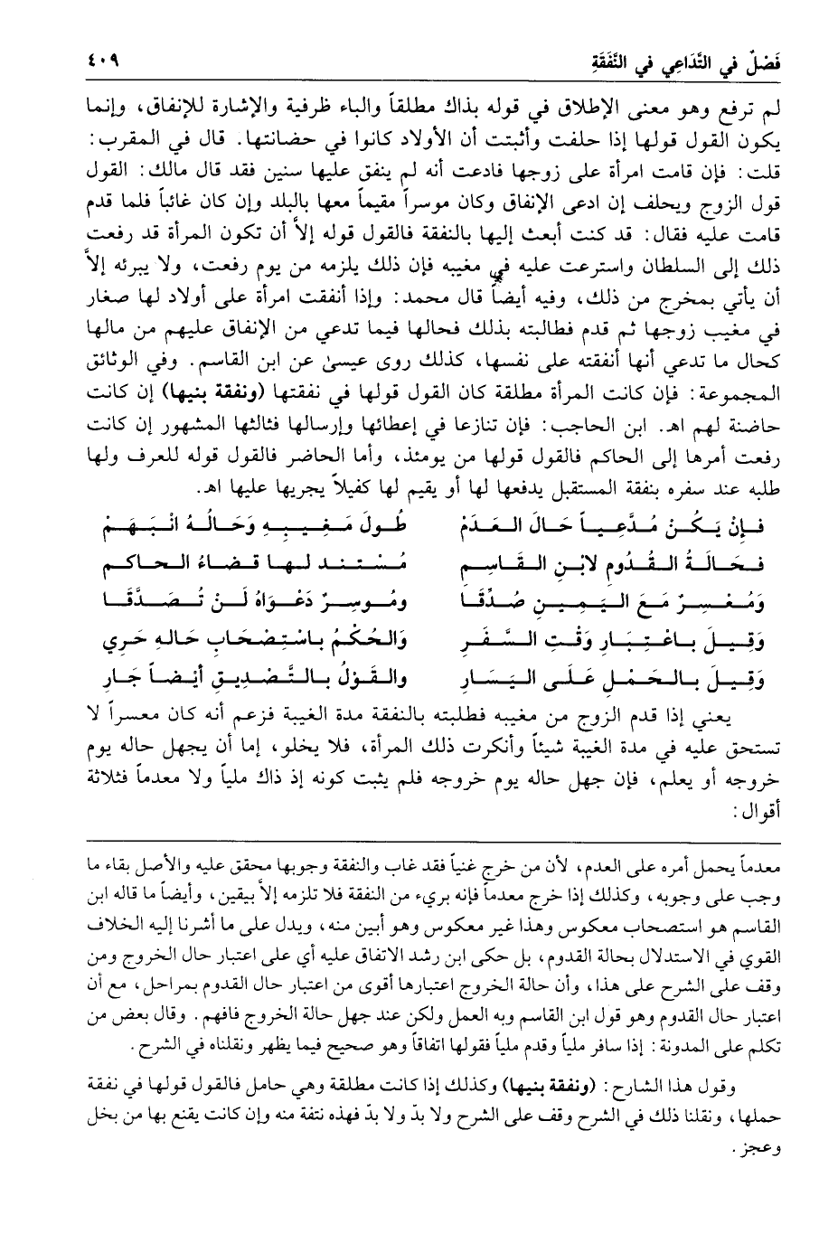 ابن الحاجب فإن تنازعا في إعطائها وإرسالها فثالثها المشهور إن كانت رفعت أمرها إلى الحاكم فالقول قولها من يومئذ وأما الحاضر فالقول قوله للعرف ولها طلبه عند سفره بنفقة المستقبل يدفعها لها أو يقيم لها كفيلا يجريها عليها ا هـ فإن يكن مدعيا حال العدم طول مغيبه وحاله انبهم فحالة القدوم لابن القاسم مستند لها قضاء الحاكم وفمعسر مع اليمين صدقا وموسر دعواه لن تصدقا وقيل باعتبار وقت السفر والحكم باستصحاب حاله حري وقيل بالحمل على اليسار والقول بالتصديق أيضا جار يعني إذا قدم الزوج من مغيبه فطلبته بالنفقة مدة الغيبة فزعم أنه كان معسرا لا تستحق عليه في مدة الغيبة شيئا وأنكرت ذلك المرأة فلا يخلو إما أن يجهل حاله يوم خروجه أو يعلم فإن جهل حاله يوم خروجه فلم يثبت كونه إذ ذاك مليا ولا معدما فثلاثة أقوال