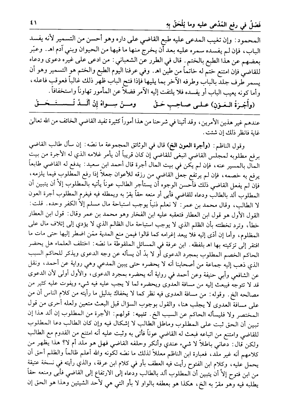 وأما كونه يعيب الباب أو يفسده فلا يلتفت إليه الآمر فضلا عن المأمور تهاونا واستخفافا وأجرة العون على طالب حق ومن سواه إن ألد تستحق
