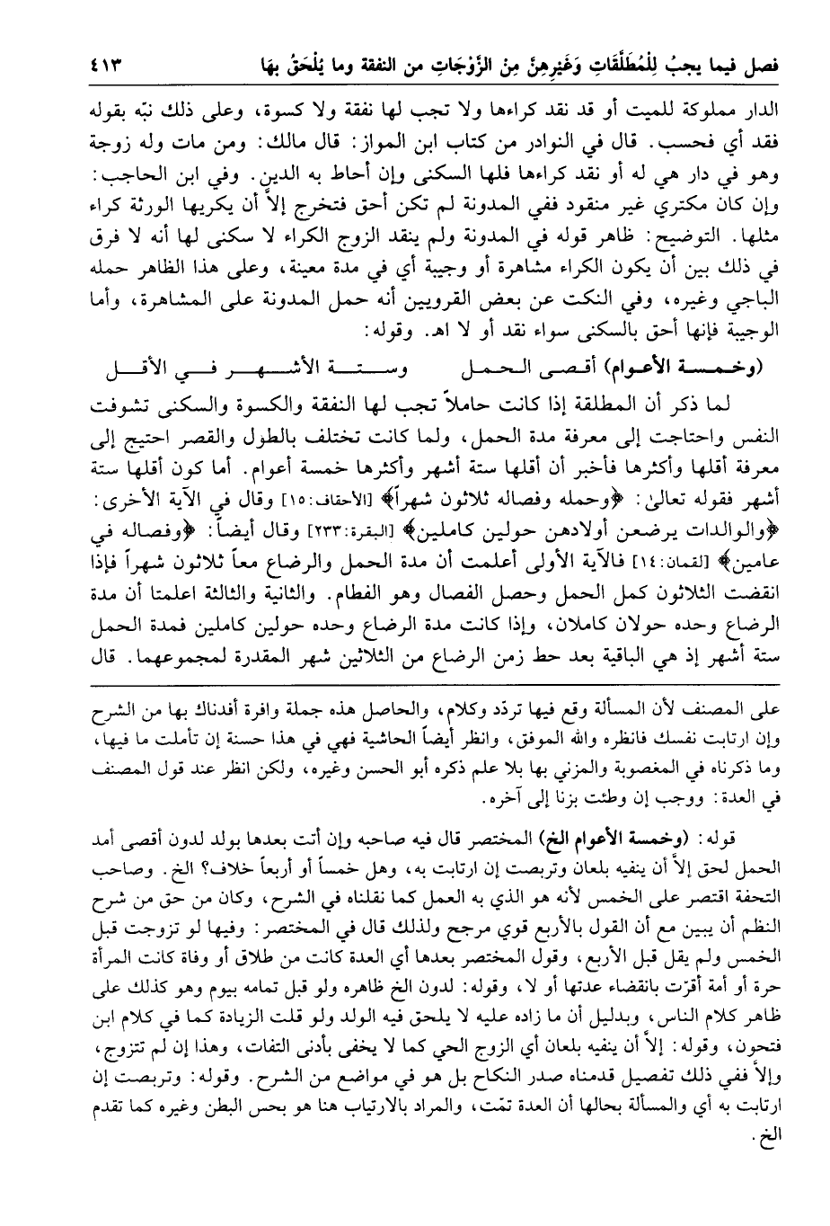 وقوله وخمسة الأعوام أقصى الحمل وستة الأشهر في الأقل لما ذكر أن المطلقة إذا كانت حاملا تجب لها النفقة والكسوة والسكنى تشوفت النفس واحتاجت إلى معرفة مدة الحمل ولما كانت تختلف بالطول والقصر احتيج إلى معرفة أقلها وأكثرها فأخبر أن أقلها ستة أشهر وأكثرها خمسة أعوام أما كون أقلها ستة أشهر فقوله تعالى وحمله وفصاله ثلاثون شهرا وقال في الآية الأخرى والوالدات يرضعن أولادهن حولين كاملين