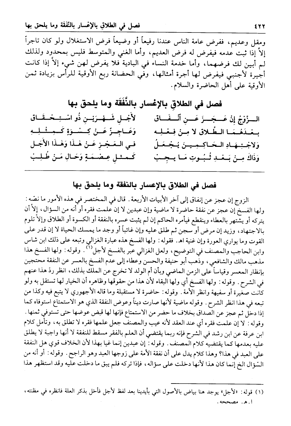 والسلام فصل في الطلاق بالإعسار بالنفقة وما يلحق بها الزوج إن عجز عن إنفاق لأجل شهرين ذو استحقاق بعدهما الطلاق لا من فعله وعاجز عن كسوة كمثله ولاجتهاد الحاكمين يجعل في العجز عن هذا وهذا الأجل وذاك من بعد ثبوت ما يجب كمثل عصمة وحال من طلب