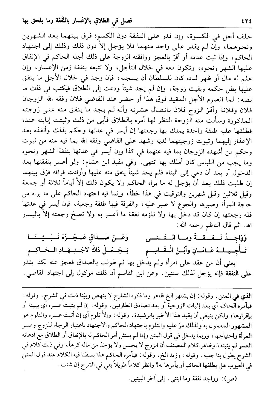 وإن علم له مال أو ظهر لدده كان للسلطان أن يسجنه فإن وجد في خلال الأجل ما ينفق عليها بطل حكمه وبقيت زوجة وإن لم يجد شيئا ودعت إلى الطلاق فيكتب في ذلك ما نصه لما انصرم الأجل المقيد فوق هذا أو حضر عند القاضي فلان وفقه الله الزوجان فلان وفلانة وأقر الزوج فلان باتصال عشرته وأنه لم يجد ما ينفق منه على زوجته المذكورة وسألت منه الزوجة النظر لها أمره بالطلاق فأبى من ذلك وثبتت إبايته عنده فطلقها عليه طلقة واحدة يملك بها رجعتها إن أيسر في عدتها وحكم بذلك وأنفذه بعد الإعذار إليهما وثبوت زوجيتهما لديه وشهد على القاضي وفقه الله بما فيه عنه من ثبوت وحكم من أشهده الزوجان بما فيه عنهما في كذا وإن أيسر في عدتها بنفقة الشهر ونحوه وما يجب من اللباس كان أملك بها انتهى