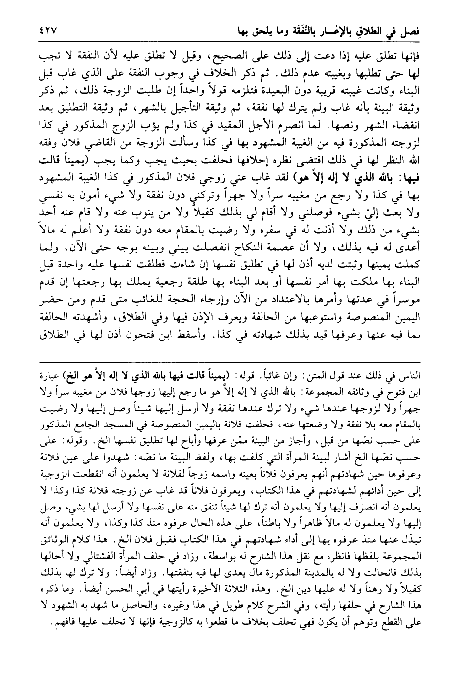 فإنها تطلق عليه إذا دعت إلى ذلك على الصحيح وقيل لا تطلق عليه لأن النفقة لا تجب لها حتى تطلبها وبغيبته عدم ذلك ثم ذكر الخلاف في وجوب النفقة على الذي غاب قبل البناء وكانت غيبته قريبة دون البعيدة فتلزمه قولا واحدا إن طلبت الزوجة ذلك ثم ذكر وثيقة البينة بأنه غاب ولم يترك لها نفقة ثم وثيقة التأجيل بالشهر ثم وثيقة التطليق بعد انقضاء الشهر ونصها لما انصرم الأجل المقيد في كذا ولم يؤب الزوج المذكور في كذا لزوجته المذكورة فيه من الغيبة المشهود بها في كذا وسألت الزوجة من القاضي فلان وفقه الله النظر لها في ذلك اقتضى نظره إحلافها فحلفت بحيث يجب