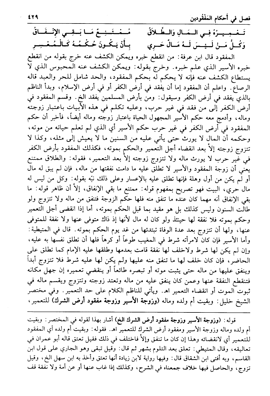 ويأتي للناظم الكلام على حد التعمير وفي مختصر الشيخ خليل وبقيت أم ولده وماله وزوجة الأسير وزوجة مفقود أرض الشرك للتعمير