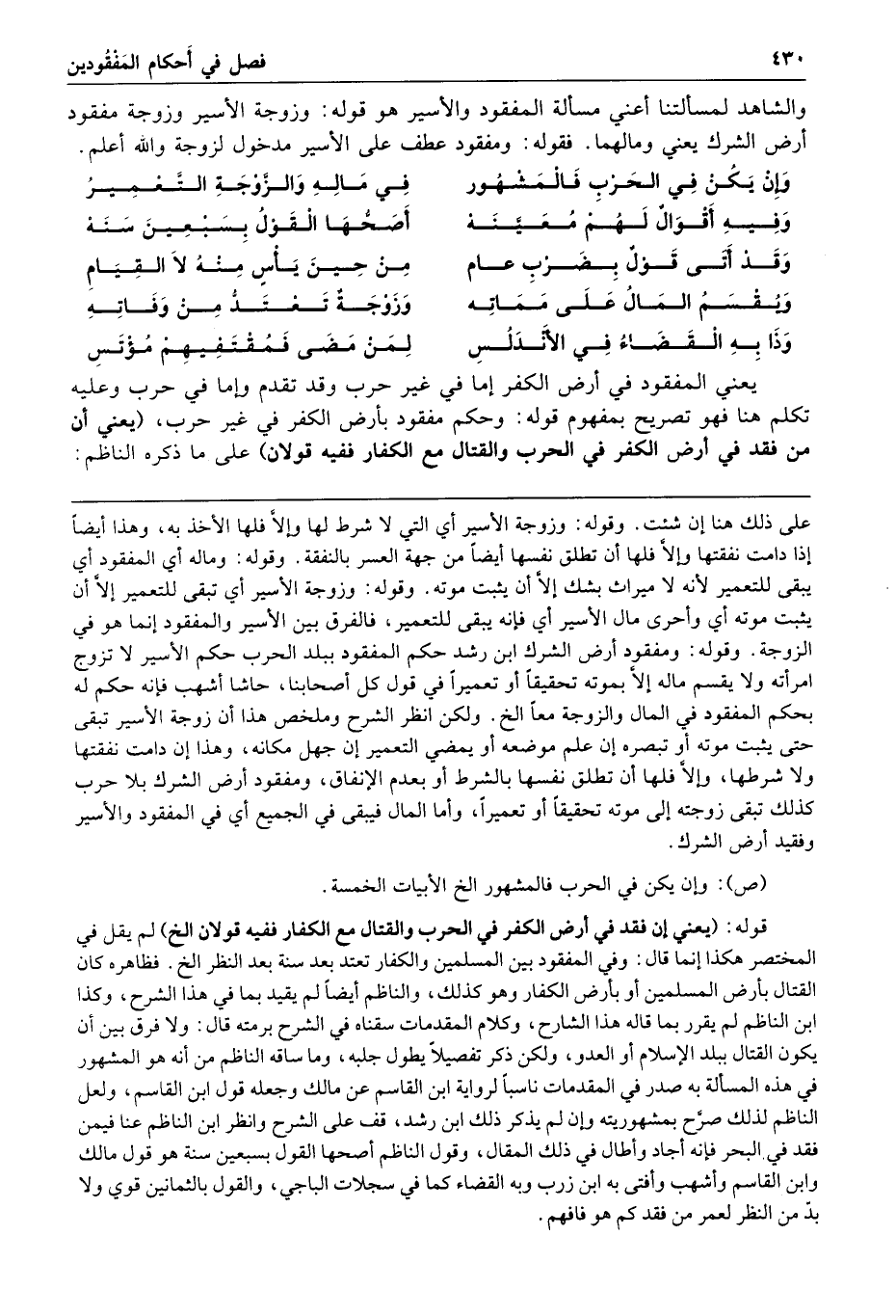 والشاهد لمسألتنا أعني مسألة المفقود والأسير هو قوله وزوجة الأسير وزوجة مفقود أرض الشرك يعني ومالهما فقوله ومفقود عطف على الأسير مدخول لزوجة والله أعلم