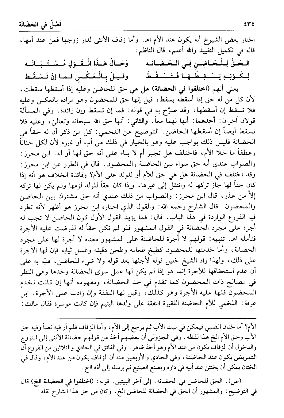 قال الشارح رحمه الله والقول الذي اختاره ابن محرز هو أظهر لأنه تطرد فيه الفروع الواردة في هذا الباب قال فما يؤيد القول الأول كون الحاضن لا تجب له أجرة على مجرد الحضانة في القول المشهور فلو لم تكن حقا له لفرضت عليه الأجرة فتأمله