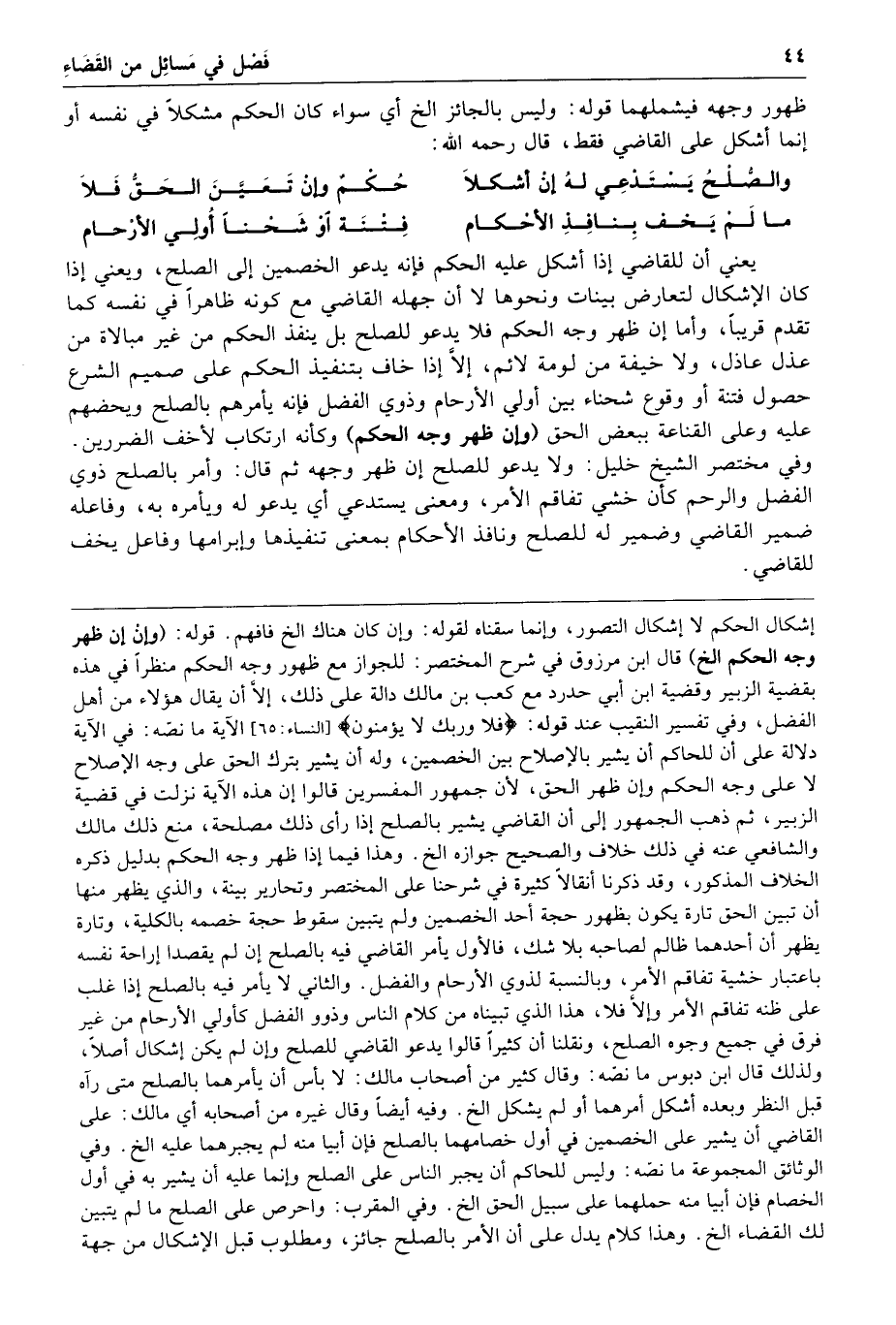 إلخ أي سواء كان الحكم مشكلا في نفسه أو إنما أشكل على القاضي فقط قال رحمه الله والصلح يستدعى له إن أشكلا حكم وإن تعين الحق فلا ما لم يخف بنافذ الأحكام فتنة أو شحنا أولي الأرحام يعني أن للقاضي إذا أشكل عليه الحكم فإنه يدعو الخصمين إلى الصلح ويعني إذا كان الإشكال لتعارض بينات ونحوها لا إن جهله القاضي مع كونه ظاهرا في نفسه كما تقدم قريبا وأما إن ظهر وجه الحكم فلا يدعو للصلح بل ينفذ الحكم من غير مبالاة من عذل عاذل ولا خيفة من لومة لائم إلا إذا خاف بتنفيذ الحكم على صميم الشرع حصول فتنة أو وقوع شحناء بين أولي الأرحام وذوي الفضل فإنه يأمرهم بالصلح ويحضهم عليه وعلى القناعة ببعض الحق وإن ظهر وجه الحكم وكأنه ارتكاب لأخف الضررين وفي مختصر الشيخ خليل ولا يدعو للصلح إن ظهر وجهه ثم قال وأمر بالصلح ذوي الفضل والرحم كأن خشي تفاقم الأمر ومعنى يستدعي أي يدعو له ويأمره به وفاعله ضمير القاضي وضمير له للصلح ونافذ الأحكام بمعنى تنفيذها وإبرامها وفاعل يخف للقاضي