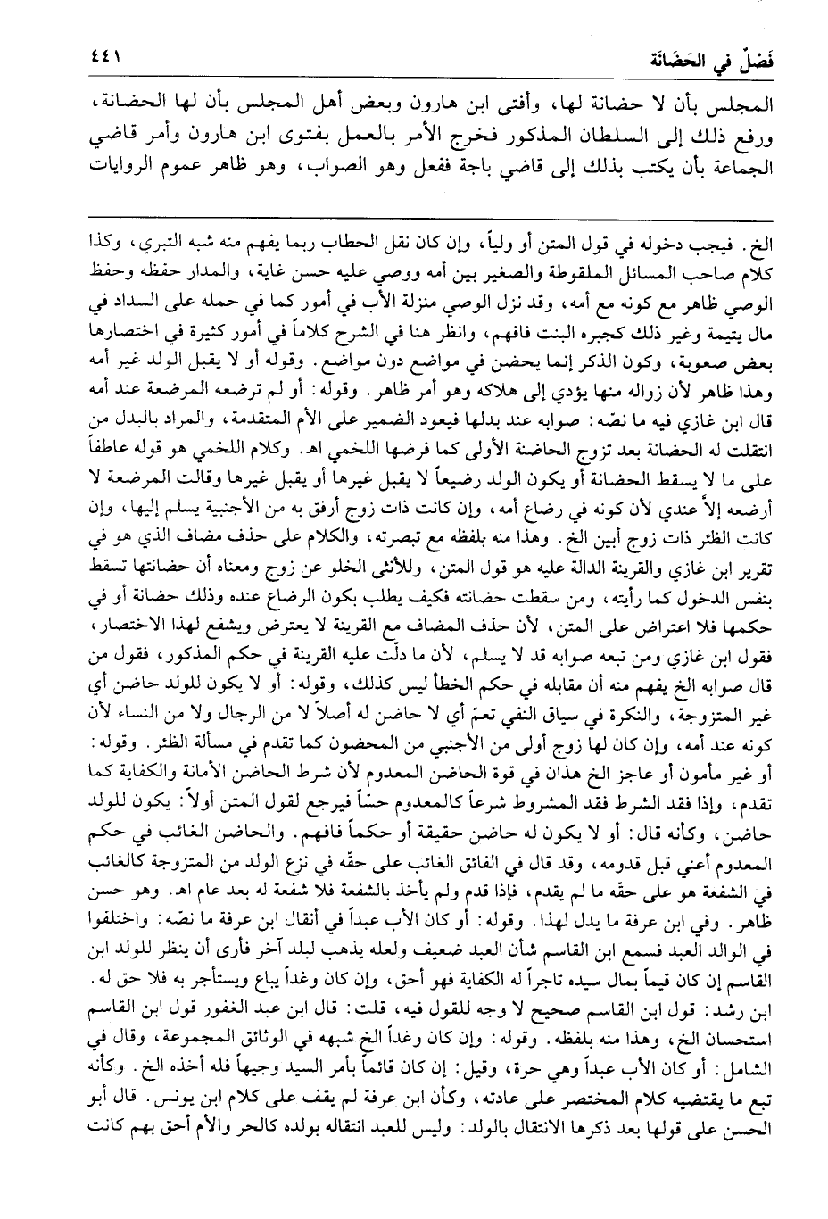 المجلس بأن لا حضانة لها وأفتى ابن هارون وبعض أهل المجلس بأن لها الحضانة ورفع ذلك إلى السلطان المذكور فخرج الأمر بالعمل بفتوى ابن هارون وأمر قاضي الجماعة بأن يكتب بذلك إلى قاضي باجة ففعل وهو الصواب وهو ظاهر عموم الروايات