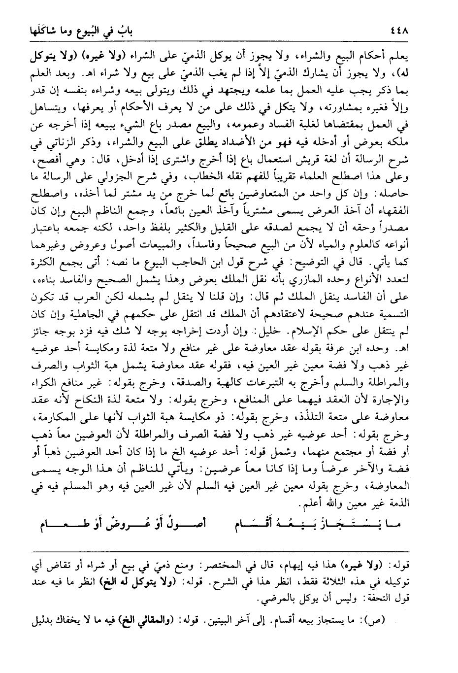 وبعد العلم بما ذكر يجب عليه العمل بما علمه ويجتهد في ذلك ويتولى بيعه وشراءه بنفسه إن قدر وإلا فغيره بمشاورته ولا يتكل في ذلك على من لا يعرف الأحكام أو يعرفها ويتساهل في العمل بمقتضاها لغلبة الفساد وعمومه
