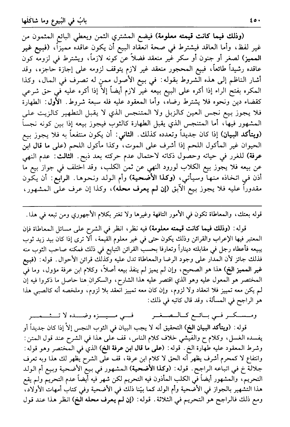 وقد أشار الناظم إلى هذه الشروط بقوله في بيع الأصول ممن له تصرف في المال وكذا المكره بفتح الراء إذا أكره على البيع بيعه غير لازم أيضا إلا إذا أكره عليه في حق شرعي كقضاء دين ونحوه فلا يشترط رضاه وأما المعقود عليه فله سبعة شروط الأول الطهارة فلا يجوز بيع نجس العين كالزبل ولا المتنجس الذي لا يقبل التطهير كالزيت على المشهور فيها أما المتنجس الذي يقبل الطهارة كالثوب فيجوز بيعه إذا بين كونه نجسا ويتأكد البيان إذا كان جديدا وتعدده كذلك