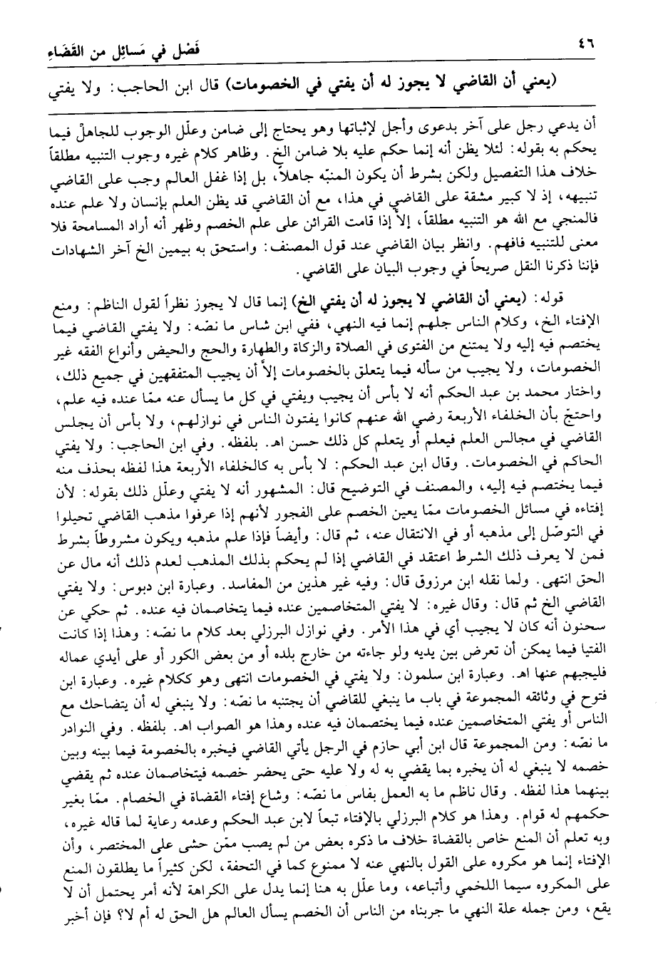 يعني أن القاضي لا يجوز له أن يفتي في الخصومات