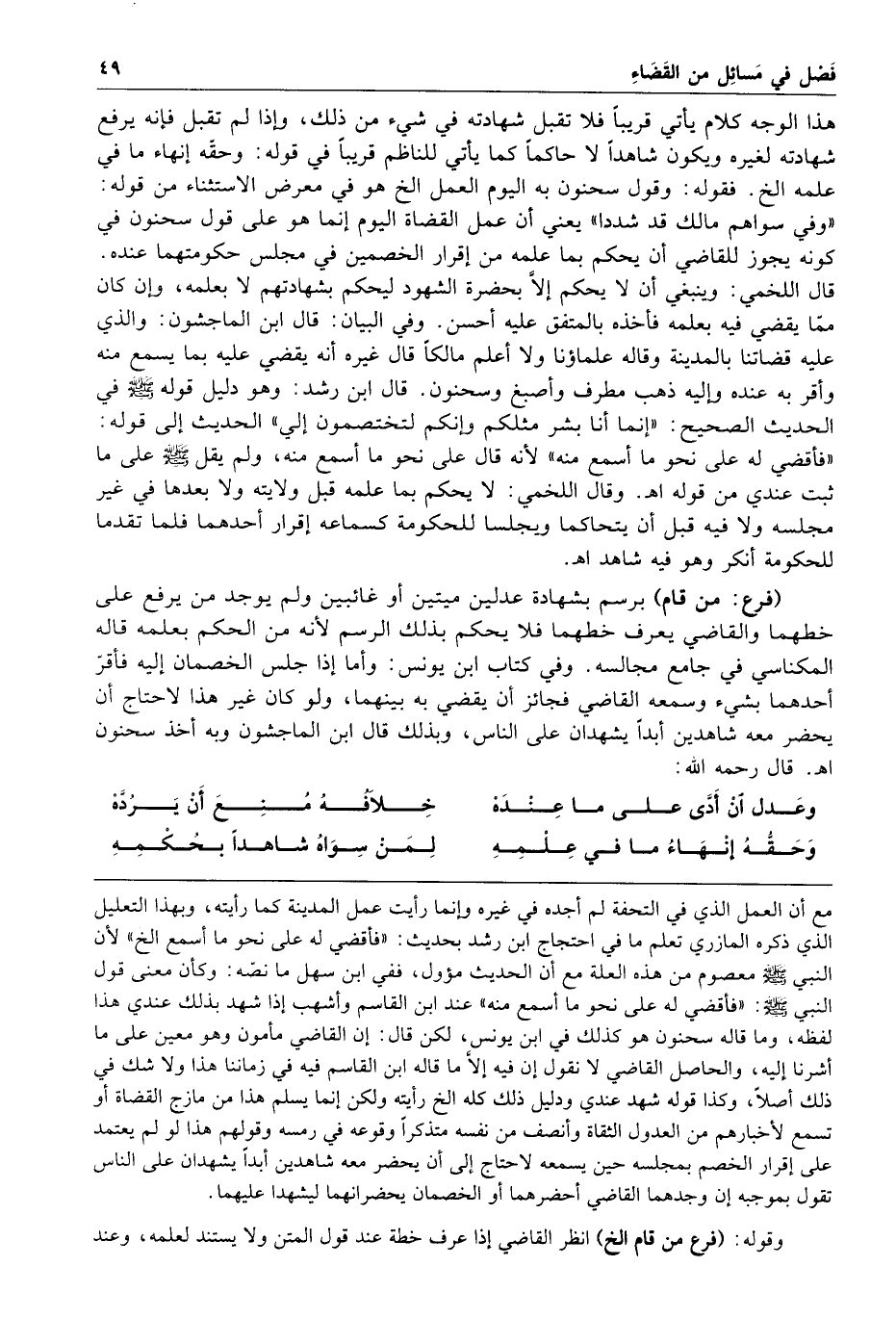 إلخ هو في معرض الاستثناء من قوله وفي سواهم مالك قد شددا يعني أن عمل القضاة اليوم إنما هو على قول سحنون في كونه يجوز للقاضي أن يحكم بما علمه من إقرار الخصمين في مجلس حكومتهما عنده