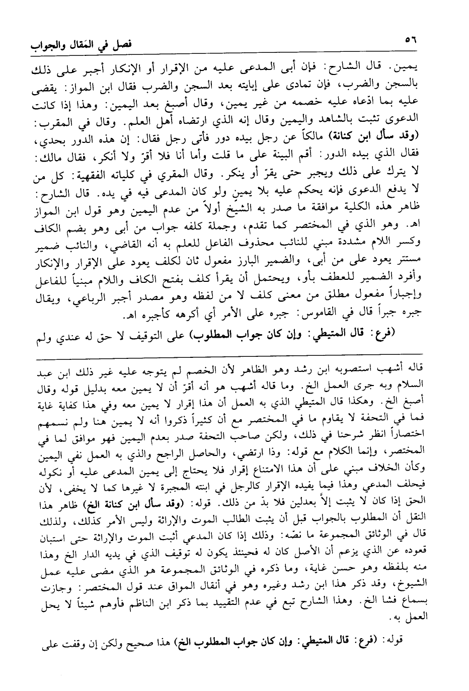 قال الشارح فإن أبى المدعى عليه من الإقرار أو الإنكار أجبر على ذلك بالسجن والضرب فإن تمادى على إبايته بعد السجن والضرب فقال ابن المواز يقضي عليه بما ادعاه عليه خصمه من غير يمين وقال أصبغ بعد اليمين وهذا إذا كانت الدعوى تثبت بالشاهد واليمين وقال إنه الذي ارتضاه أهل العلم