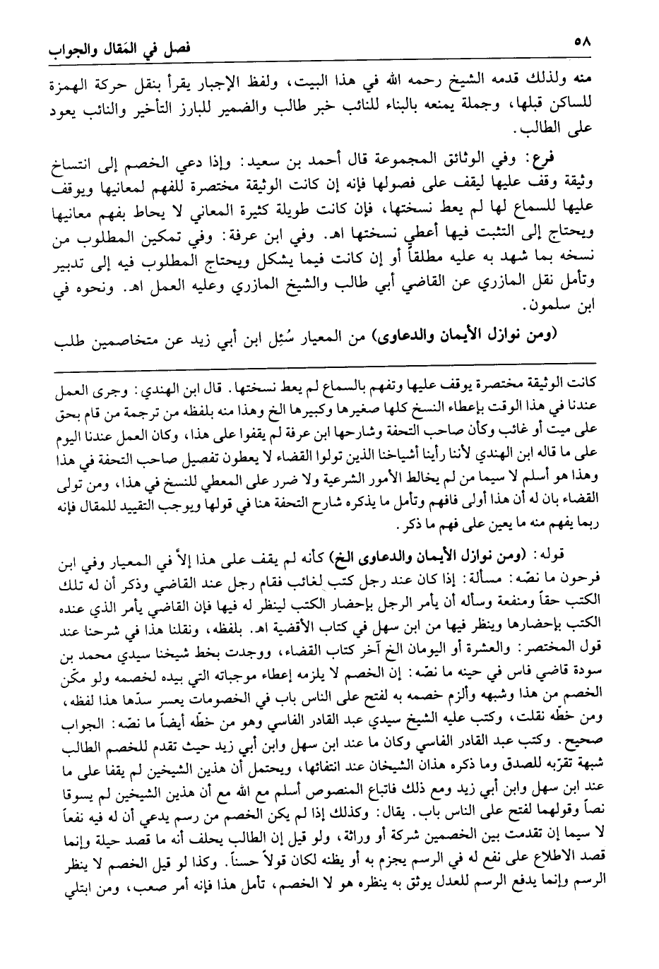 ونحوه في ابن سلمون ومن نوازل الأيمان والدعاوى من المعيار سئل ابن أبي زيد عن متخاصمين طلب