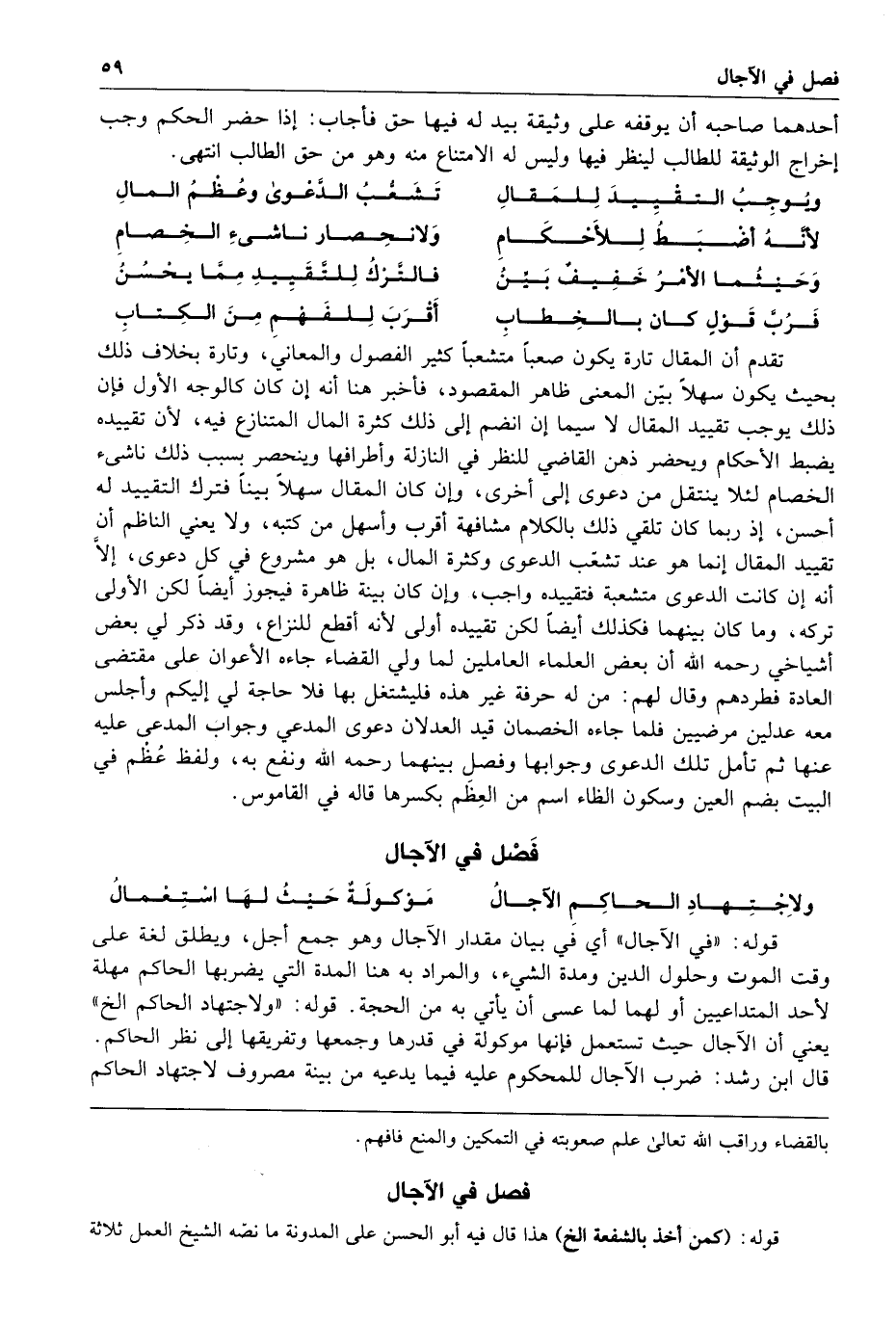 ولفظ عظم في البيت بضم العين وسكون الظاء اسم من العظم بكسرها قاله في القاموس فصل في الآجال ولاجتهاد الحاكم الآجال موكولة حيث لها استعمال قوله في الآجال أي في بيان مقدار الآجال وهو جمع أجل ويطلق لغة على وقت الموت وحلول الدين ومدة الشيء والمراد به هنا المدة التي يضربها الحاكم مهلة لأحد المتداعيين أو لهما لما عسى أن يأتي به من الحجة