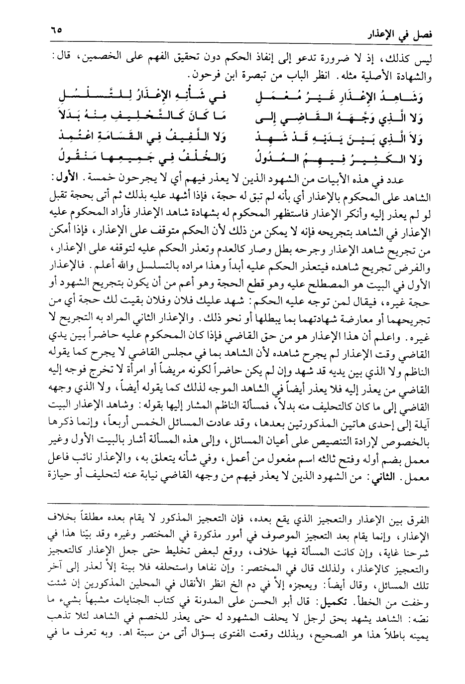 ليس كذلك إذ لا ضرورة تدعو إلى إنفاذ الحكم دون تحقيق الفهم على الخصمين قال والشهادة الأصلية مثله انظر الباب من تبصرة ابن فرحون وشاهد الإعذار غير معمل في شأنه الإعذار للتسلسل ولا الذي وجهه القاضي إلى ما كان كالتحليف منه بدلا ولا الذي بين يديه قد شهد ولا اللفيف في القسامة اعتمد ولا الكثير فيهم العدول والخلف في جميعها منقول عدد في هذه الأبيات من الشهود الذين لا يعذر فيهم أي لا يجرحون خمسة
