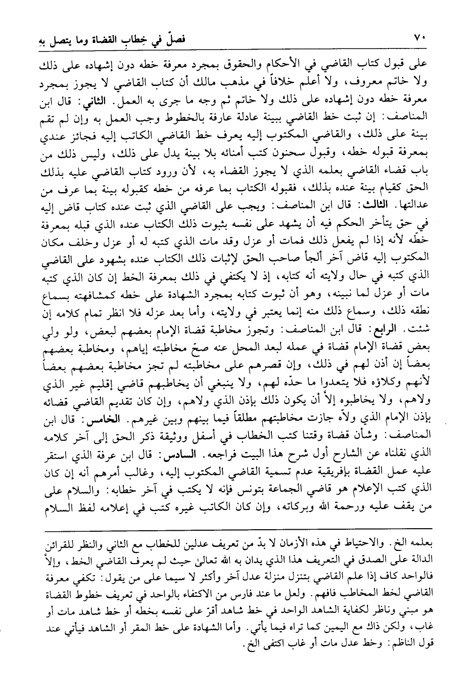 السادس قال ابن عرفة الذي استقر عليه عمل القضاة بإفريقية عدم تسمية القاضي المكتوب إليه وغالب أمرهم أنه إن كان الذي كتب الإعلام هو قاضي الجماعة بتونس فإنه لا يكتب في آخر خطابه والسلام على من يقف عليه ورحمة الله وبركاته وإن كان الكاتب غيره كتب في إعلامه لفظ السلام