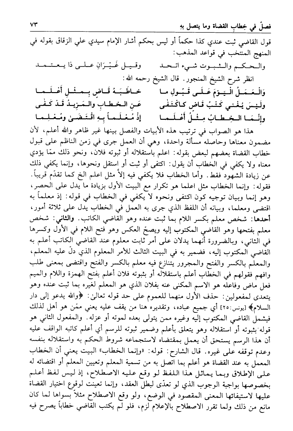 قال الشيخ رحمه الله والعمل اليوم على قبول ما خاطبه قاض بمثل أعلم وليس يغني كتب قاض كاكتفى عن الخطاب والمزيد قد كفى وإنما الخطاب مثل أعلما إذ معلما به اقتضى ومعلما هذا هو الصواب في ترتيب هذه الأبيات والفصل بينها غير ظاهر والله أعلم لأن مضمن معناها وحاصله مسألة واحدة وهي أن العمل جرى في زمن الناظم على قبول خطاب القضاة بعضهم لبعض بقوله أعلم باستقلاله أو ثبوته فلان ونحو ذلك مما يؤدي معناه ولا يكفي في الخطاب أن يقول اكتفى أو ثبت أو استقل ونحوها وإنما يكفي ذلك عن زيادة الشهود فقط
