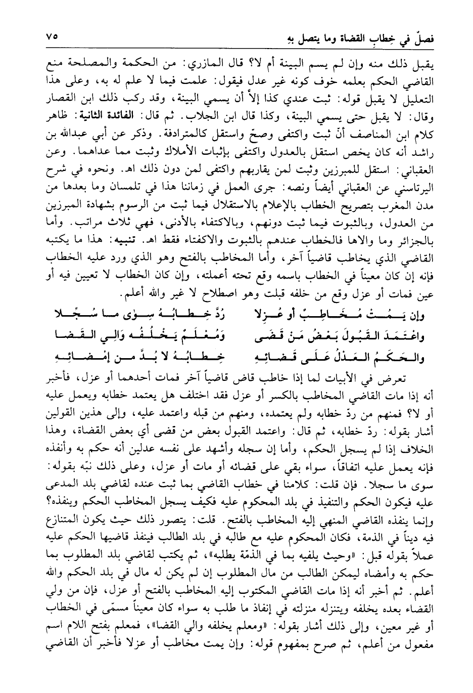 ثم أخبر أنه إذا مات القاضي المكتوب إليه المخاطب بالفتح أو عزل فإن من ولي القضاء بعده يخلفه ويتنزل منزلته في إنفاذ ما طلب به سواء كان معينا مسمى في الخطاب أو غير معين وإلى ذلك أشار بقوله ومعلم يخلفه والي القضا فمعلم بفتح اللام اسم مفعول من أعلم ثم صرح بمفهوم قوله وإن يمت مخاطب أو عزلا فأخبر أن القاضي