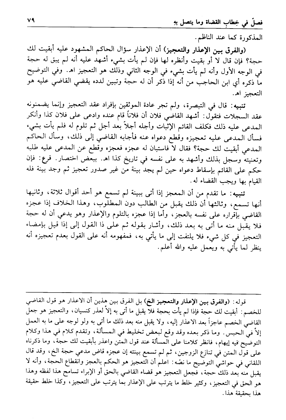المذكورة كما عند الناظم والفرق بين الإعذار والتعجيز أن الإعذار سؤال الحاكم المشهود عليه أبقيت لك حجة فإن قال لا أو بقيت وأنظره لها فإن لم يأت بشيء أشهد عليه أنه لم يبق له حجة في الوجه الأول وأنه لم يأت بشيء في الوجه الثاني وذلك هو التعجيز ا هـ