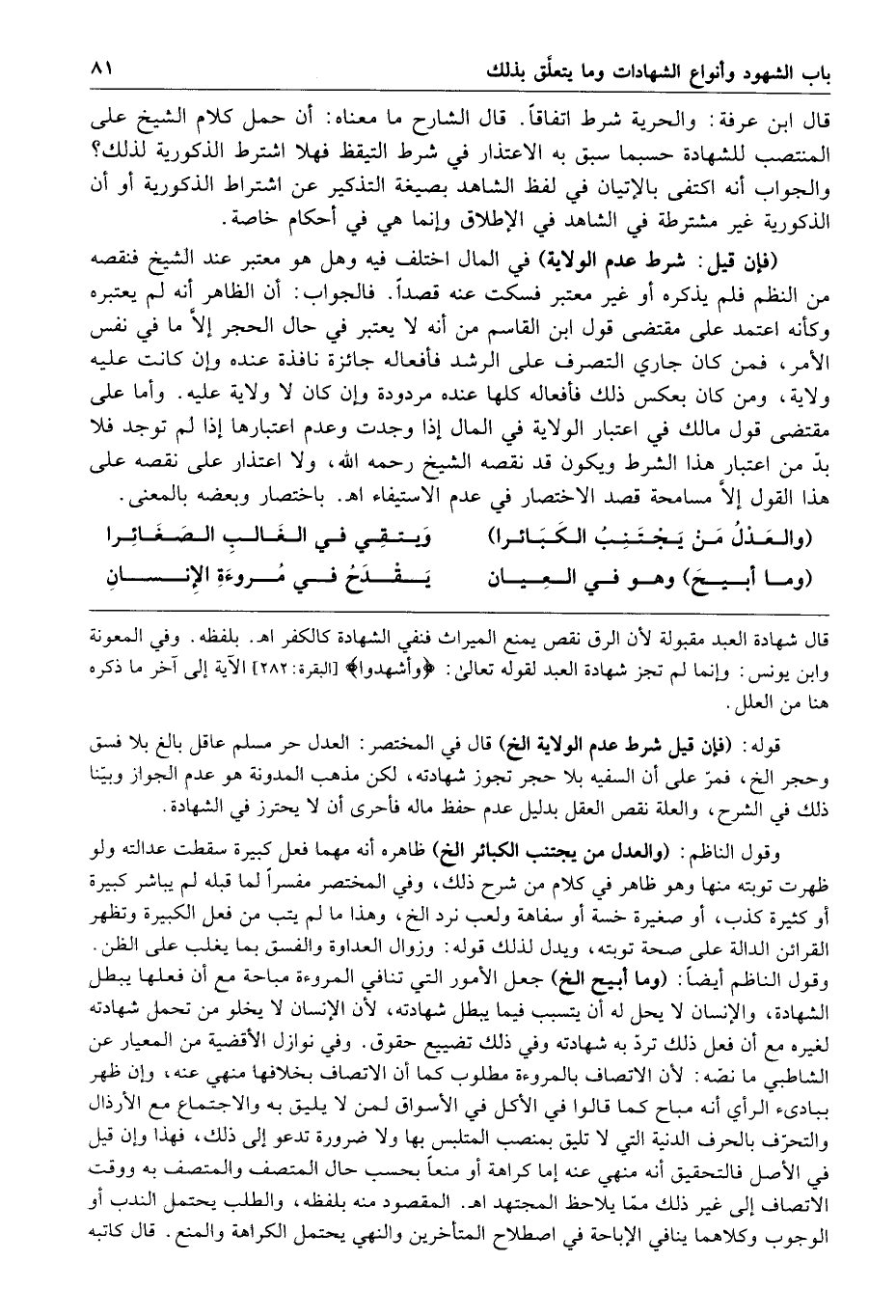 قال ابن عرفة والحرية شرط اتفاقا قال الشارح ما معناه إن حمل كلام الشيخ على المنتصب للشهادة حسبما سبق به الاعتذار في شرط التيقظ فهلا اشترط الذكورية لذلك والجواب أنه اكتفى بالإتيان في لفظ الشاهد بصيغة التذكير عن اشتراط الذكورية أو أن الذكورية غير مشترطة في الشاهد في الإطلاق وإنما هي في أحكام خاصة فإن قيل شرط عدم الولاية في المال اختلف فيه وهل هو معتبر عند الشيخ فنقصه من النظم فلم يذكره أو غير معتبر فسكت عنه قصدا فالجواب أن الظاهر أنه لم يعتبره وكأنه اعتمد على مقتضى قول ابن القاسم من أنه لا يعتبر في حال الحجر إلا ما في نفس الأمر فمن كان جاري التصرف على الرشد فأفعاله جائزة نافذة عنده وإن كانت عليه ولاية ومن كان بعكس ذلك فأفعاله كلها عنده مردودة وإن كان لا ولاية عليه وأما على مقتضى قول مالك في اعتبار الولاية في المال إذا وجدت وعدم اعتبارها إذا لم توجد فلا بد من اعتبار هذا الشرط ويكون قد نقصه الشيخ رحمه الله ولا اعتذار على نقصه على هذا القول إلا مسامحة قصد الاختصار في عدم الاستيفاء ا هـ باختصار وبعضه بالمعنى