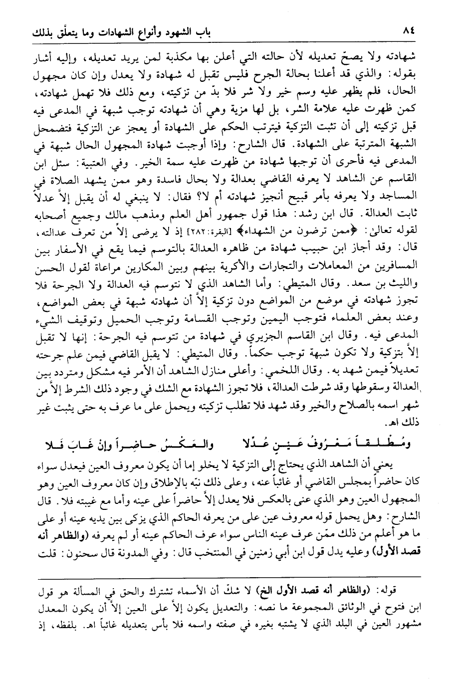 وقال ابن القاسم الجزيري في شهادة من تتوسم فيه الجرحة أنها لا تقبل إلا بتزكية ولا تكون شبهة توجب حكما وقال المتيطي لا يقبل القاضي فيمن علم جرحته تعديلا فيمن شهد به وقال اللخمي وأعلى منازل الشاهد أن الأمر فيه مشكل ومتردد بين العدالة وسقوطها وقد شرطت العدالة فلا تجوز الشهادة مع الشك في وجود ذلك الشرط إلا من شهر اسمه بالصلاح والخير وقد شهد فلا تطلب تزكيته ويحمل على ما عرف به حتى يثبت غير ذلك ا هـ