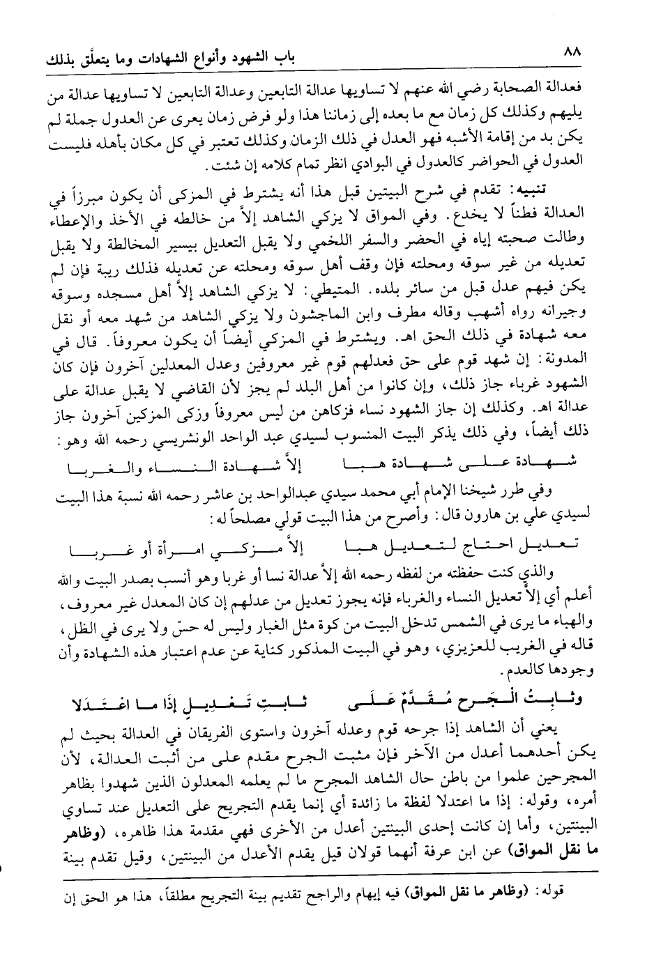 وكذلك إن جاز الشهود نساء فزكاهن من ليس معروفا وزكى المزكين آخرون جاز ذلك أيضا وفي ذلك يذكر البيت المنسوب لسيدي عبد الواحد الونشريسي رحمه الله وهو شهادة على شهادة هبا إلا شهادة النساء والغربا وفي طرر شيخنا الإمام أبي محمد سيدي عبد الواحد بن عاشر رحمه الله نسبة هذا البيت لسيدي علي بن هارون قال وأصرح من هذا البيت قولي مصلحا له تعديل احتاج لتعديل هبا إلا مزكي امرأة أو غربا والذي كنت حفظته من لفظه رحمه الله إلا عدالة نسا أو غربا وهو أنسب بصدر البيت والله أعلم أي إلا تعديل النساء والغرباء فإنه يجوز تعديل من عدلهم إن كان المعدل غير معروف والهباء ما يرى في الشمس تدخل البيت من كوة مثل الغبار وليس له حس ولا يرى في الظل قاله في الغريب للعزيزي وهو في البيت المذكور كناية عن عدم اعتبار هذه الشهادة وإن وجودها كالعدم