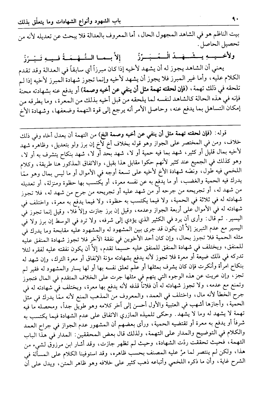 ولأخيه يشهد المبرز إلا بما التهمة فيه تبرز يعني أن الشاهد يجوز له أن يشهد لأخيه إذا كان مبرزا أي سابقا في العدالة وقد تقدم الكلام عليه وأما غير المبرز فلا يجوز أن يشهد لأخيه وإنما تجوز شهادة المبرز لأخيه إذا لم تلحقه في ذلك تهمة فإن لحقته تهمة مثل أن ينفي عن أخيه وصمة أو يدفع عنه بشهادته محنة فإنه في هذه الحالة كالشاهد لنفسه لما يلحقه من قبل أخيه بذلك من المعرة وما يطرقه من إمكان التساهل بما يدفع عنه وحاصل الأمر أنه يرجع إلى قوة التهمة وضعفها وشهادة الأخ