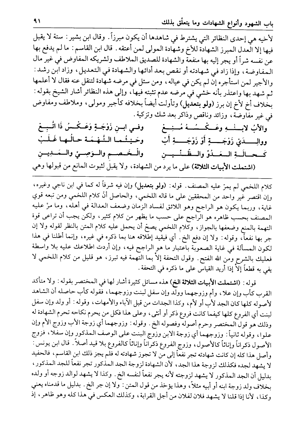 وقال ابن بشير ستة لا يقبل فيها إلا العدل المبرز الشهادة للأخ وشهادة المولى لمن أعتقه قال ابن القاسم ما لم يدفع بها عن نفسه شرا أو يجر إليه بها منفعة والشهادة للصديق الملاطف ولشريكه المفاوض في غير مال المفاوضة وإذا زاد في شهادته أو نقص بعد أدائها والشهادة في التعديل وزاد ابن رشد والأجير لمن استأجره إن لم يكن في عياله ومن سئل في مرضه شهادة لتنقل عنه فقال لا أعلمها ثم شهد بها واعتذر بأنه خشي في مرضه عدم تثبته فيها وإلى هذه النظائر أشار الشيخ بقوله بخلاف أخ لأخ إن برز ولو بتعديل وتأولت أيضا بخلافه كأجير ومولى وملاطف ومفاوض في غير مفاوضة وزائد وناقص وذاكر بعد شك وتزكية والأب لابنه وعكسه منع وفي ابن زوجة وعكس ذا اتبع ووالدي زوجة أو زوجة أب وحيثما التهمة حالها غلب كحالة العدو والظنين والخصم والوصي والمدين اشتملت الأبيات الثلاثة على ما يرد من الشهادة ولا يقبل لثبوت المانع من قبولها وهي