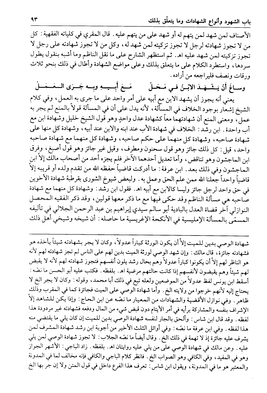 فقول ابن رشد وشهادة كل منهما مع شهادة صاحبه هي مسألة الناظم وقد حكى فيها مع ما ذكر معها قولين وقد ذكر الفقيه المحصل النوازلي آخر قضاة العدل بالبادية أبو سالم سيدي إبراهيم بن عبد الرحمن الجلالي في تأليفه المسمى بالمسألة الأمليسية في الأنكحة الأغريسية ما حاصله أن شيخه وشيخي أهل ذلك