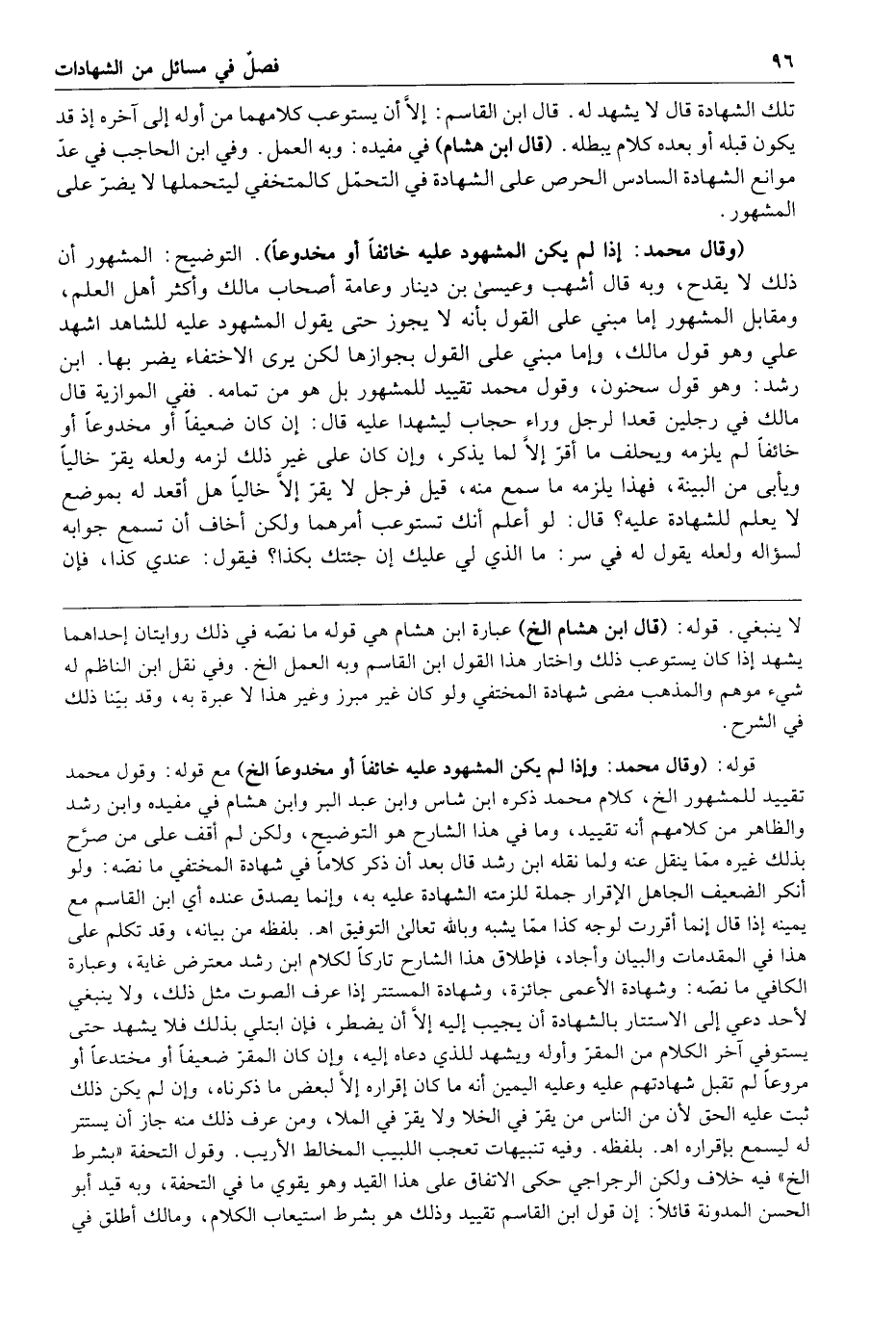 تلك الشهادة قال لا يشهد له قال ابن القاسم إلا أن يستوعب كلامهما من أوله إلى آخره إذ قد يكون قبله أو بعده كلام يبطله قال ابن هشام في مفيده وبه العمل وفي ابن الحاجب في عد موانع الشهادة السادس الحرص على الشهادة في التحمل كالمتخفي ليتحملها لا يضر على المشهور وقال محمد إذا لم يكن المشهود عليه خائفا أو مخدوعا التوضيح المشهور أن ذلك لا يقدح وبه قال أشهب وعيسى بن دينار وعامة أصحاب مالك وأكثر أهل العلم