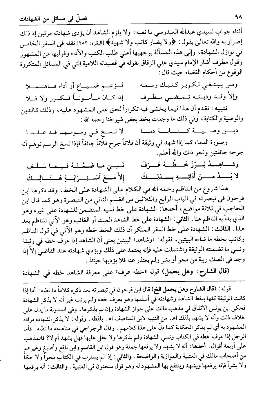 أثناء جواب لسيدي عبد الله العبدوسي ما نصه ولا يلزم الشاهد أن يؤدي شهادته مرتين إذ ذلك إضرار به والله تعالى يقول ولا يضار كاتب ولا شهيد نقله في السفر الخامس في نوازل الشهادة وإلى هذه المسألة بوجهيها أعني طلب الكتب والأداء وقوليها من المشهور وقول مطرف أشار الإمام سيدي علي الزقاق بقوله في قصيدته اللامية التي في المسائل المتكررة الوقوع من أحكام القضاء حيث قال ومن يبتغي تكرير كتبك رسمه لزعم ضياع أو أداء فأهملا وإلا وقد وديته تمضي مطرف إذا كان مأمونا فكرر ولا فلا تنبيه تقدم أن هذا فيما يخشى فيه تكرارا لحق على المشهود عليه وذلك كالدين والوصية والكتابة وفي ذلك ما وجدت بخط بعض شيوخنا رحمه الله دين وصية كتابة دما لا نسخ في رسومها قد علما وصورة الدماء كما إذا شهد في وثيقة أن فلانا جرح فلانا جائفا فإذا نسخ الرسم توهم أنه جرحه جائفتين ونحو ذلك والله أعلم