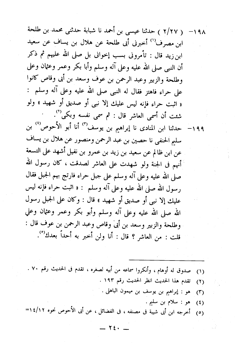 199 - حَدَّثَنَا ابْنُ الْمُنَادِي، نا إِبْرَاهِيمُ بْنُ يُوسُفَ، أنا أَبُو الْأَحْوَصِ بْنُ سُلَيْمٍ الْحَنَفِيُّ، نا حُصَيْنُ بْنُ عَبْدِ الرَّحْمَنِ، وَمَنْصُورٌ، عَنْ هِلَالِ بْنِ يَسَافٍ، عَنِ ابْنِ ظَالِمٍ، عَنْ سَعِيدِ بْنِ زَيْدِ بْنِ عَمْرِو بْنِ نُفَيْلٍ، أَشْهَدُ عَلَى التِّسْعَةِ أَنَّهُمْ فِي الْجَنَّةِ وَلَوْ شَهِدْتُ عَلَى الْعَاشِرِ لَصَدَقْتُ، كَانَ رَسُولُ اللَّهِ صَلَّى اللَّهُ عَلَيْهِ وَعَلَى آلِهِ وَسَلَّمَ عَلَى جَبَلِ حِرَاءٍ فَارْتَجَّ بِهِمُ الْجَبَلُ، فَقَالَ رَسُولُ اللَّهِ صَلَّى اللَّهُ عَلَيْهِ وَعَلَى آلِهِ وَسَلَّمَ: «§اثْبُتْ حِرَاءُ، فَإِنَّهُ لَيْسَ عَلَيْكَ إِلَّا نَبِيٌّ أَوْ صِدِّيقٌ أَوْ شَهِيدٌ» . قَالَ: وَكَانَ عَلَى الْجَبَلِ رَسُولُ اللَّهِ صَلَّى اللَّهُ عَلَيْهِ وَعَلَى آلِهِ وَسَلَّمَ وَأَبُو بَكْرٍ، وَعُمَرُ، وَعُثْمَانُ، وَعَلِيٌّ، وَطَلْحَةُ، وَالزُّبَيْرُ، وَسَعْدُ بْنُ أَبِي وَقَّاصٍ، وَعَبْدُ الرَّحْمَنِ بْنُ عَوْفٍ قَالَ: قُلْتُ: مَنِ الْعَاشِرُ؟ قَالَ: أَنَا وَلَنْ أُخْبِرَ بِهِ أَحَدًا بَعْدَكَ "