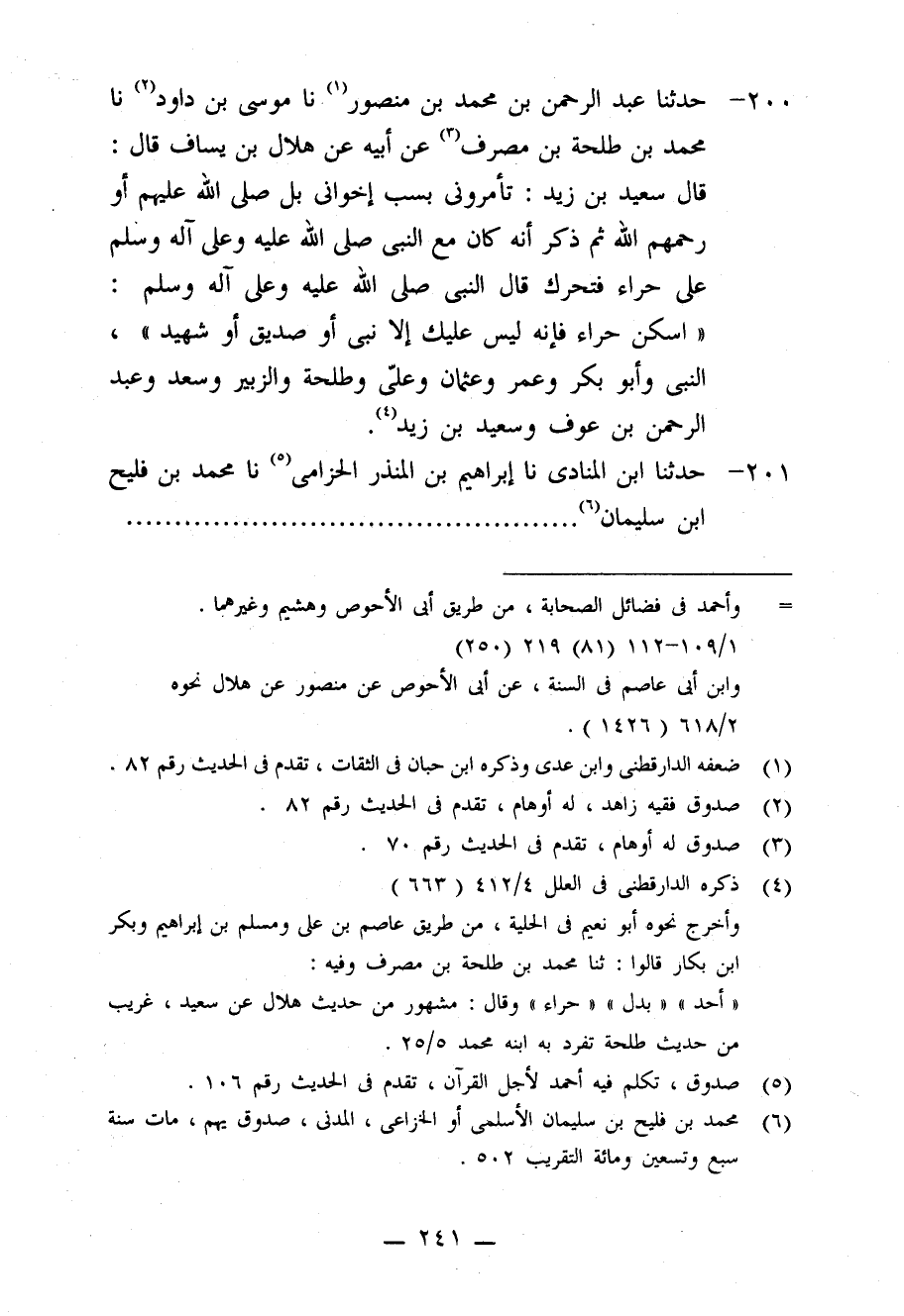 200 - حَدَّثَنَا عَبْدُ الرَّحْمَنِ بْنُ مُحَمَّدِ بْنِ مَنْصُورٍ، نا مُوسَى بْنُ دَاوُدَ، نا مُحَمَّدُ بْنُ طَلْحَةَ بْنِ مُصَرِّفٍ، عَنْ أَبِيهِ، عَنْ هِلَالِ بْنِ يَسَافٍ قَالَ: قَالَ سَعِيدُ بْنُ زَيْدٍ: تَأْمُرُونِي بِسَبِّ إِخْوَانِي، بَلْ صَلَّى اللَّهُ عَلَيْهِمْ أَوْ رَحِمَهُمُ اللَّهُ، ثُمَّ ذَكَرَ أَنَّهُ كَانَ مَعَ النَّبِيِّ صَلَّى اللَّهُ عَلَيْهِ وَعَلَى آلِهِ وَسَلَّمَ عَلَى حِرَاءٍ فَتَحَرَّكَ قَالَ النَّبِيُّ صَلَّى اللَّهُ عَلَيْهِ وَعَلَى آلِهِ وَسَلَّمَ: «§اسْكُنْ حِرَاءُ، فَإِنَّهُ لَيْسَ عَلَيْكَ إِلَّا نَبِيٌّ أَوْ صِدِّيقٌ أَوْ شَهِيدٌ» . النَّبِيُّ وَأَبُو بَكْرٍ، وَعُمَرُ، وَعُثْمَانُ، وَعَلِيٌّ، وَطَلْحَةُ، وَالزُّبَيْرُ، وَسَعْدٌ، وَعَبْدُ الرَّحْمَنِ بْنُ عَوْفٍ، وَسَعِيدُ بْنُ زَيْدٍ