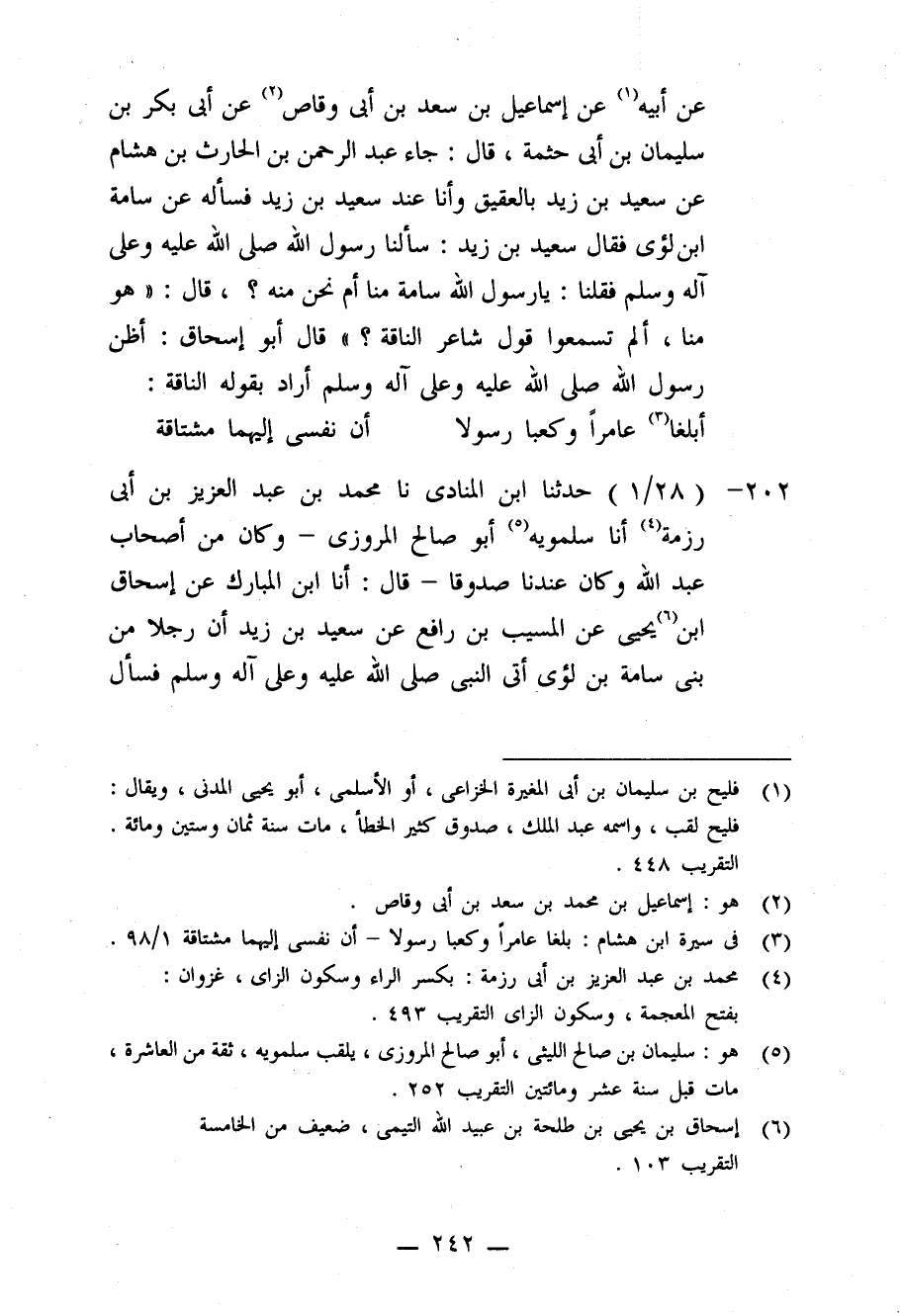 202 - حَدَّثَنَا ابْنُ الْمُنَادِي، نا مُحَمَّدُ بْنُ عَبْدِ الْعَزِيزِ بْنِ أَبِي رِزْمَةَ، أنا سَلَمَوَيْهِ أَبُو صَالِحٍ الْمَرْوَزِيُّ، وَكَانَ مِنْ أَصْحَابِ عَبْدِ اللَّهِ، وَكَانَ عِنْدَنَا صَدُوقًا قَالَ: أنا ابْنُ الْمُبَارَكِ، عَنْ إِسْحَاقَ بْنِ يَحْيَى، عَنِ الْمُسَيَّبِ بْنِ رَافِعٍ، عَنْ سَعِيدِ بْنِ زَيْدٍ أَنَّ رَجُلًا مِنْ بَنِي سَامَةَ بْنِ لُؤَيٍّ أَتَى النَّبِيَّ صَلَّى اللَّهُ عَلَيْهِ وَعَلَى آلِهِ وَسَلَّمَ فَسَأَلَ وَأَدْلَا بِحَقِّهِ ثُمَّ نَامَ، فَقَالَ النَّبِيُّ صَلَّى اللَّهُ عَلَيْهِ وَعَلَى آلِهِ وَسَلَّمَ: «مَنْ هَذَا؟» قَالُوا: هَذَا مِنْ بَنِي سَامَةَ بْنِ لُؤَيٍّ، فَقَالَ رَسُولُ اللَّهِ صَلَّى اللَّهُ عَلَيْهِ وَعَلَى آلِهِ وَسَلَّمَ: «§اسْتَوْصُوا بِهِمْ خَيْرًا لِأَنَّهُمْ إِخْوَانُكُمْ»