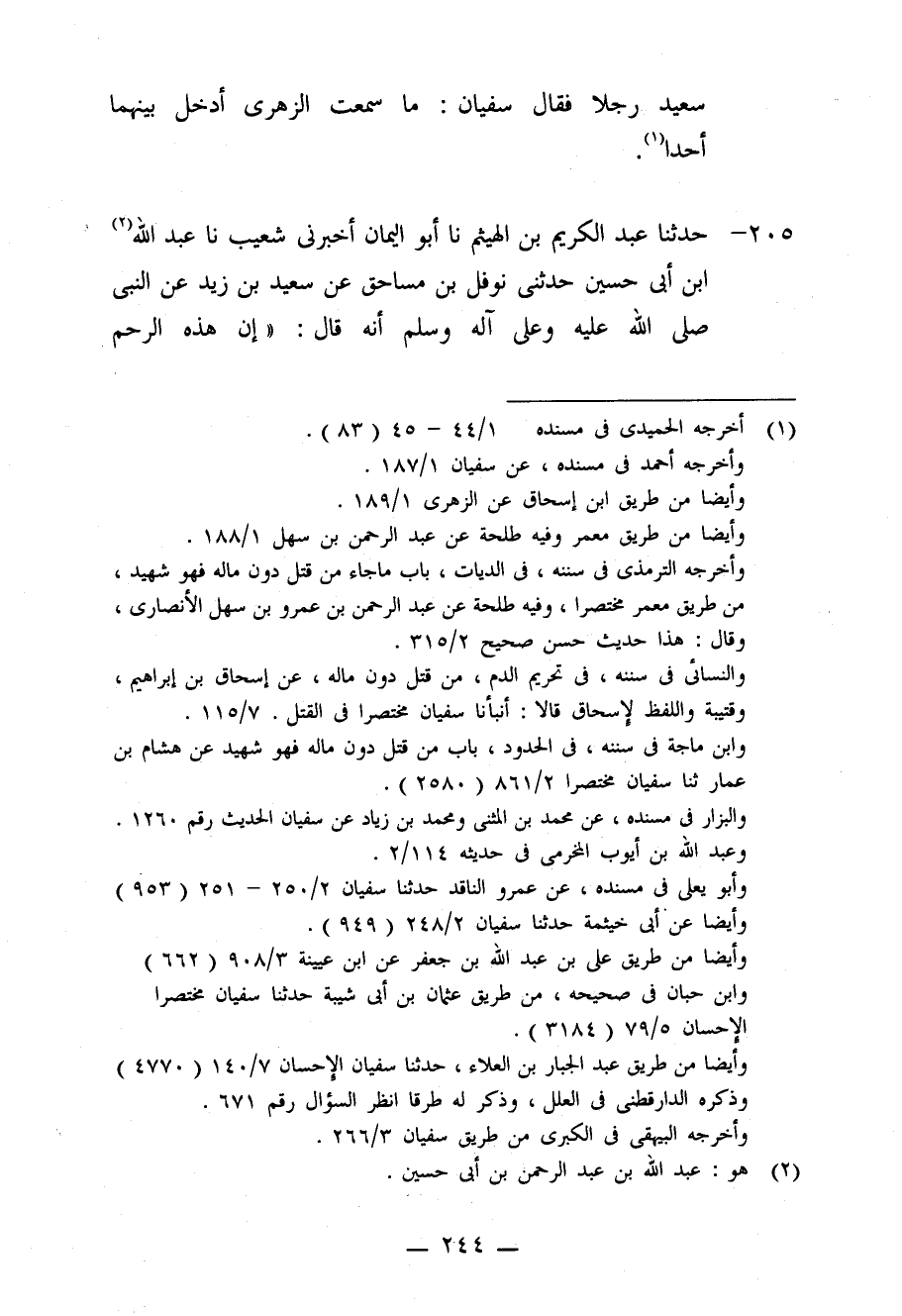 205 - حَدَّثَنَا عَبْدُ الْكَرِيمِ بْنُ الْهَيْثَمِ، نا أَبُو الْيَمَانِ، أَخْبَرَنِي شُعَيْبٌ، نا عَبْدُ اللَّهِ بْنُ أَبِي حُسَيْنٍ، حَدَّثَنِي نَوْفَلُ بْنُ مُسَاحِقٍ، عَنْ سَعِيدِ بْنِ زَيْدٍ، عَنِ النَّبِيِّ صَلَّى اللَّهُ عَلَيْهِ وَعَلَى آلِهِ وَسَلَّمَ أَنَّهُ قَالَ: «إِنَّ §هَذِهِ الرَّحِمَ شِجْنَةٌ مِنَ الرَّحْمَنِ، فَمَنْ قَطَعَهَا حَرَّمَ اللَّهُ عَلَيْهِ الْجَنَّةَ»