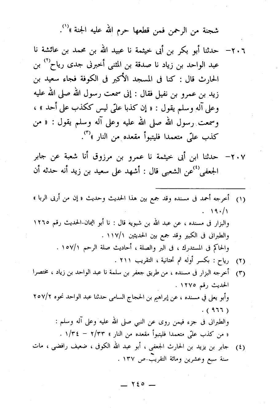 206 - حَدَّثَنَا أَبُو بَكْرِ بْنُ أَبِي خَيْثَمَةَ، نا عُبَيْدُ اللَّهِ بْنُ مُحَمَّدِ ابْنِ عَائِشَةَ، نا عَبْدُ الْوَاحِدِ بْنُ زِيَادٍ، نا صَدَقَةُ بْنُ الْمُثَنَّى، أَخْبَرَنِي جَدِّي رَيَّاحُ بْنُ الْحَارِثِ قَالَ: كُنَّا فِي الْمَسْجِدِ الْأَكْبَرِ فِي الْكُوفَةِ، فَجَاءَ سَعِيدُ بْنُ زَيْدِ بْنِ عَمْرِو بْنِ نُفَيْلٍ، فَقَالَ: إِنِّي سَمِعْتُ رَسُولَ اللَّهِ صَلَّى اللَّهُ عَلَيْهِ وَعَلَى آلِهِ وَسَلَّمَ يَقُولُ: «§إِنَّ كَذِبًا عَلَيَّ لَيْسَ كَكَذِبٍ عَلَى أَحَدٍ»
