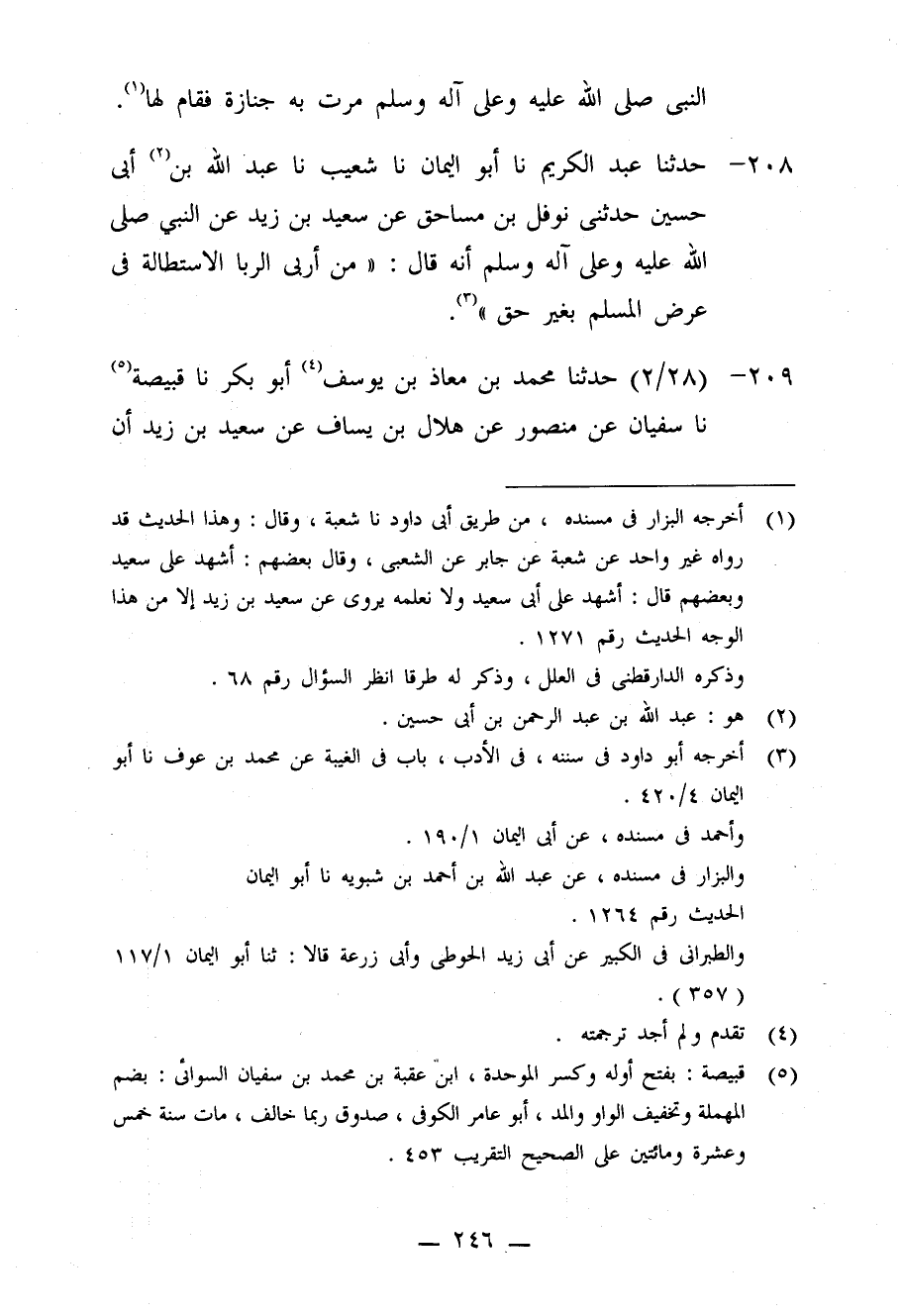 208 - حَدَّثَنَا عَبْدُ الْكَرِيمِ، نا أَبُو الْيَمَانِ، نا شُعَيْبٌ، نا عَبْدُ اللَّهِ بْنُ أَبِي حُسَيْنٍ، حَدَّثَنِي نَوْفَلُ بْنُ مُسَاحِقٍ، عَنْ سَعِيدِ بْنِ زَيْدٍ، عَنِ النَّبِيِّ صَلَّى اللَّهُ عَلَيْهِ وَعَلَى آلِهِ وَسَلَّمَ أَنَّهُ قَالَ: «§مِنْ أَرْبَى الرِّبَا الِاسْتِطَالَةُ فِي عِرْضِ الْمُسْلِمِ بِغَيْرِ حَقٍّ»