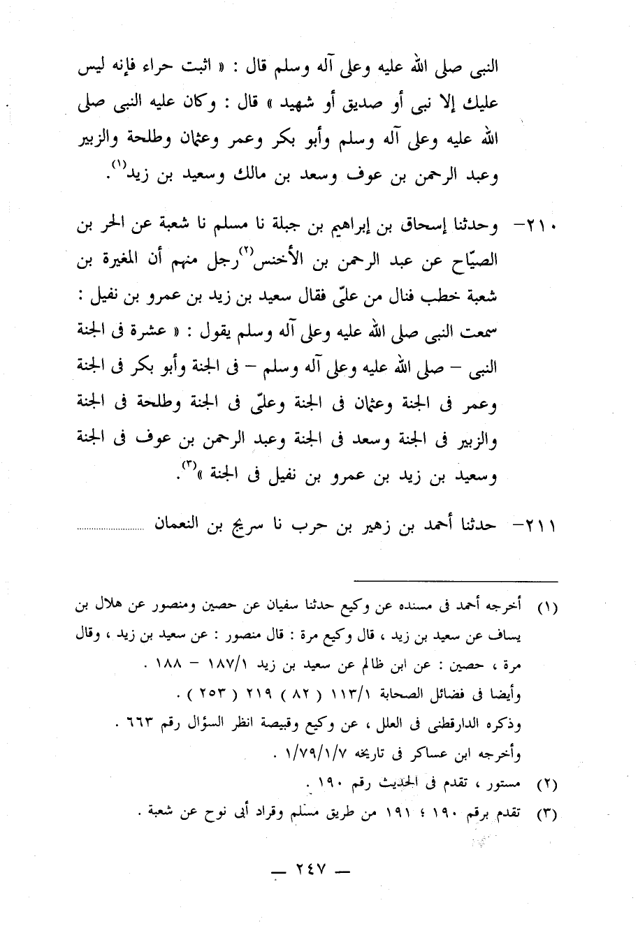211 - حَدَّثَنَا أَحْمَدُ بْنُ زُهَيْرِ بْنِ حَرْبٍ، نا سُرَيْجُ بْنُ النُّعْمَانِ أَبُو الْحَسَنِ، نا مُحَمَّدُ بْنُ طَلْحَةَ، عَنْ طَلْحَةَ بْنِ مُصَرِّفٍ، عَنْ هِلَالِ بْنِ يَسَافٍ، عَنْ سَعِيدِ بْنِ زَيْدِ بْنِ عَمْرِو بْنِ نُفَيْلٍ قَالَ: تَأْمُرُونِي بِسَبِّ إِخْوَانِي، بَلْ صَلَّى اللَّهُ عَلَيْهِمْ، أَوْ بَلْ غَفَرَ لَهُمْ، ثُمَّ ذَكَرَ أَنَّهُ كَانَ مَعَ النَّبِيِّ صَلَّى اللَّهُ عَلَيْهِ وَعَلَى آلِهِ وَسَلَّمَ عَلَى حِرَاءٍ، فَذَكَرَ أَنَّهُ تَحَرَّكَ، قَالَ: «§اسْكُنْ حِرَاءُ، فَإِنَّهُ لَيْسَ عَلَيْكَ إِلَّا نَبِيٌّ أَوْ صِدِّيقٌ أَوْ شَهِيدٌ» . فَعَدَّ أَبَا بَكْرٍ، وَعُمَرَ، وَعَلِيًّا، وَعُثْمَانَ، وَطَلْحَةَ , وَالزُّبَيْرَ , وَسَعْدَ بْنَ أَبِي وَقَّاصٍ , وَعَبْدَ الرَّحْمَنِ بْنَ عَوْفٍ , وَسَعِيدَ بْنَ زَيْدِ بْنِ عَمْرِو بْنِ نُفَيْلٍ وَهُوَ التَّاسِعُ. كَذَا قَالَ عَلِيٌّ , وَعُثْمَانُ.