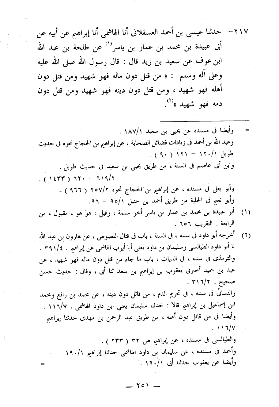 217 - حَدَّثَنَا عِيسَى بْنُ أَحْمَدَ الْعَسْقَلَانِيُّ، أنا الْهَاشِمِيُّ، أنا إِبْرَاهِيمُ، عَنْ أَبِيهِ، عَنْ أَبِي عُبَيْدَةَ بْنِ مُحَمَّدِ بْنِ عَمَّارِ بْنِ يَاسِرٍ، عَنْ طَلْحَةَ بْنِ عَبْدِ اللَّهِ بْنِ عَوْفٍ، عَنْ سَعِيدِ بْنِ زَيْدٍ قَالَ: قَالَ رَسُولُ اللَّهِ صَلَّى اللَّهُ عَلَيْهِ وَعَلَى آلِهِ وَسَلَّمَ: «§مَنْ قُتِلَ دُونَ مَالِهِ فَهُوَ شَهِيدٌ، وَمَنْ قُتِلَ دُونَ أَهْلِهِ فَهُوَ شَهِيدٌ وَمَنْ قُتِلَ دُونَ دِينِهِ فَهُوَ شَهِيدٌ، وَمَنْ قُتِلَ دُونَ دَمِهِ فَهُوَ شَهِيدٌ»