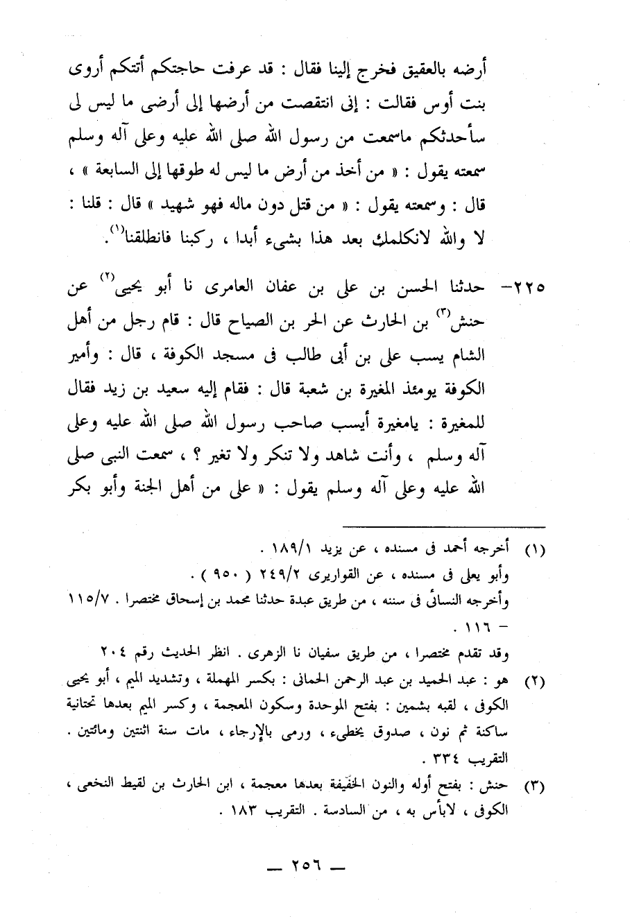 225 - حَدَّثَنَا الْحَسَنُ بْنُ عَلِيِّ بْنِ عَفَّانَ الْعَامِرِيُّ، نا أَبُو يَحْيَى، عَنْ حَنَشِ بْنِ الْحَارِثِ، عَنِ الْحُرِّ بْنِ الصَّيَّاحِ قَالَ: قَامَ رَجُلٌ مِنْ أَهْلِ الشَّامِ يَسُبُّ عَلِيَّ بْنَ أَبِي طَالِبٍ فِي مَسْجِدِ الْكُوفَةِ قَالَ: وَأَمِيرُ الْكُوفَةِ يَوَمَئِذٍ الْمُغِيرَةُ بْنُ شُعْبَةَ قَالَ: فَقَامَ إِلَيْهِ سَعِيدُ بْنُ زَيْدٍ فَقَالَ لِلْمُغِيرَةِ: يَا مُغِيرَةُ، أَيُسَبُّ صَاحِبُ رَسُولِ اللَّهِ صَلَّى اللَّهُ عَلَيْهِ وَعَلَى آلِهِ وَسَلَّمَ وَأَنْتَ شَاهِدٌ وَلَا تُنْكِرُ وَلَا تُغَيِّرُ؟ سَمِعْتُ النَّبِيَّ صَلَّى اللَّهُ عَلَيْهِ وَعَلَى آلِهِ وَسَلَّمَ يَقُولُ: «§عَلِيٌّ مِنْ أَهْلِ الْجَنَّةِ، وَأَبُو بَكْرٍ مِنْ أَهْلِ الْجَنَّةِ، وَسَعْدٌ مِنْ أَهْلِ الْجَنَّةِ، وَعَبْدُ الرَّحْمَنِ مِنْ أَهْلِ الْجَنَّةِ» . قَالَ: فَسَأَلُوهُ: مَنِ التَّاسِعُ؟ فَقَالَ: أَنَا