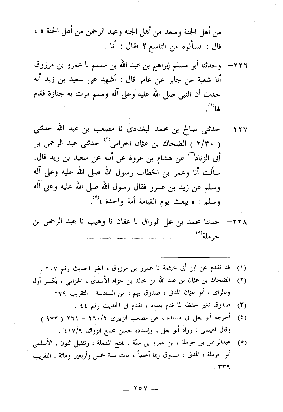 227 - حَدَّثَنِي صَالِحُ بْنُ مُحَمَّدٍ الْبَغْدَادِيُّ، نا مُصْعَبُ بْنُ عَبْدِ اللَّهِ، حَدَّثَنِي الضَّحَاكُ بْنُ عُثْمَانَ الْحِزَامِيُّ، حَدَّثَنِي عَبْدُ الرَّحْمَنِ بْنُ أَبِي الزِّنَادِ، عَنْ هِشَامِ بْنِ عُرْوَةَ، عَنْ أَبِيهِ، عَنْ سَعِيدِ بْنِ زَيْدٍ قَالَ: سَأَلْتُ أَنَا وَعُمَرُ بْنُ الْخَطَّابِ، رَسُولَ اللَّهِ صَلَّى اللَّهُ عَلَيْهِ وَعَلَى آلِهِ وَسَلَّمَ عَنْ زَيْدِ بْنِ عَمْرٍو، فَقَالَ رَسُولُ اللَّهِ صَلَّى اللَّهُ عَلَيْهِ وَعَلَى آلِهِ وَسَلَّمَ: «§يُبْعَثُ يَوْمَ الْقِيَامَةِ أُمَّةً وَحْدَهُ»